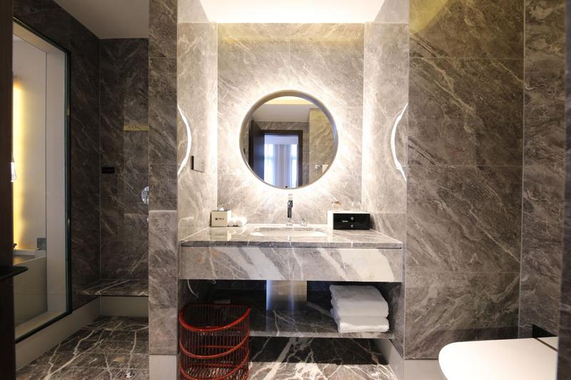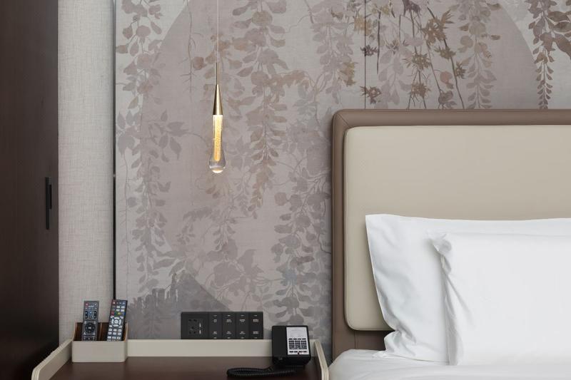 座落于渝北棕榈泉高端商业区,西临颐和高尔夫练习场,具有良好的景观视野。东临爱琴海购物中心,夜晚灯光璀璨,地处北区商圈范围,具有良好的商业价值和景观资源,交通便捷,城市繁华中的一片宁静。我们希望从高端人群的生活所需以舒适为出发点,结合居家、旅行、休闲等不同层面进行人性化思考,着力打造大堂豪华套房,餐厅等系列。酒店早餐厅也是一大亮点,270°落地窗,视野极其开阔,西式中式的结合,重庆特色饮食等。灯具采用国内一线品牌马斯登灯,洁具龙头德国当代,床垫金可儿。大堂的建筑空间我们运用精致的特殊玻璃结合水芯片的屏风及层架分出空间的段落,使狭长的大堂区域营造出不同的空间场景。大堂吧的设计延续钻石切割的处理手法,侵泻而下的发光艺术装置更是让人眼前一亮。