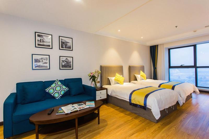 酒店位于滨海大道,紧邻新城吾悦广场,距离万达东方影都、西海岸海水浴场开车约10分钟,步行约5分钟即可到达奥特莱斯购物广场及唐岛湾海边公园,门店距公交车站约步行2分钟,众多公交线路可通往金沙滩及青岛国际啤酒节会场,青岛各大旅游景点。酒店配有大型地上免费停车场、24小时热水、中央空调、无限高速网络、房内均含电磁炉、冰箱等电器。酒店风格简约、舒适、配套设施均为高标准,房型众多,28楼29楼视野开阔,全天24小时为您提供服务,让您享受到完美的假日体验。
