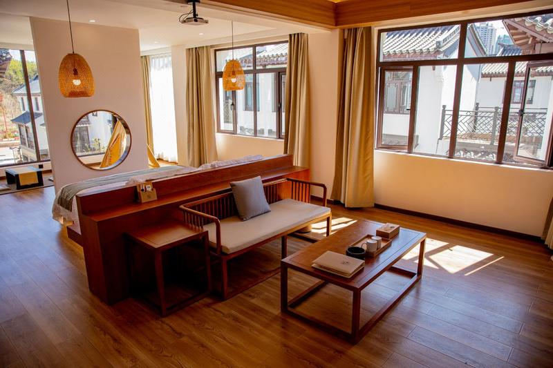 大江映雪酒店坐落于彝风湿地小镇西畔(距楚雄站约5分钟车程,距高速口约5分钟车程,距彝人古镇约5分钟车程)。是一家宠物友好型的精品设计师酒店。是一家宠物友好型的精品设计师庭院酒店。 酒店拥有几十间轻奢智能客房,配备了智能音响、智能窗帘、高清投影、轻奢床垫,面积35-120平米不等为顾客打造舒适、宽敞、智能的休闲旅途。酒店为客人配备了minibar、免费的茶室、棋牌室。 临江而落、一砖一瓦,一座一榻、 无不透露着宁静祥和,在古朴、现代交织的环境中,透露着淡淡的禅意 可以冥想、抄经、静修,亦或坐于江畔与好友对弈,感受周遭的一草一木、品味入口的一粥一饭,对于身心皆是一次不同以往的祥和体验。 庭院中,一古树、一古琴、一团蒲,一方桌,席地而坐,四周皆被流水环绕,置身其中,仿佛时间都降低了流速。 房间内,讲求“空”与“无”。墙面纯白,看似毫无修饰,却给人沉静质感。家居摆放极近简洁,让人心境明澈。无尘的房间,素雅禅境,美得很纯粹。没有浓墨重彩的勾勒,纯色墙面浅白暖光,亚麻灰色混着淡淡原木香气。功能上,在古典的环境中融入了现代科技给与人的便捷,让现代与传统交织在一起,在这样一个简居里,望着窗外的那一抹秋冬,心便自然安静了。 桥影流虹,大江映雪,故人不卷春秋。