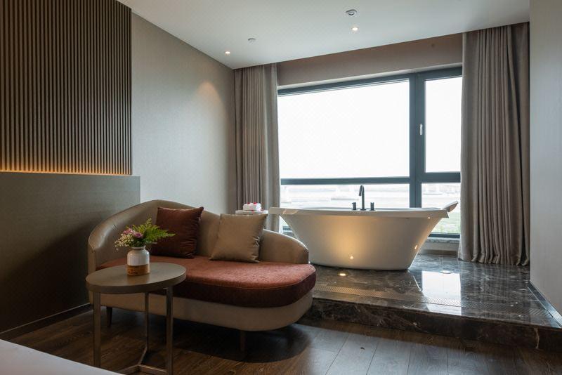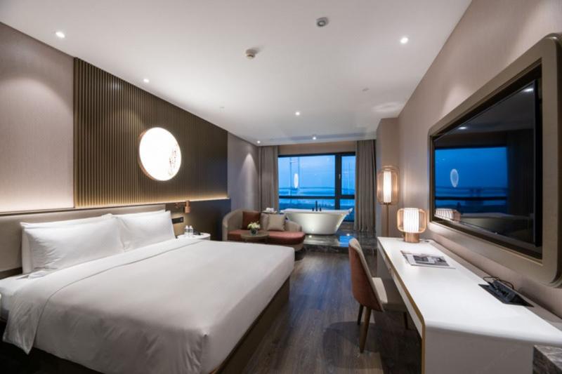 酒店位于丹东新区新中朝鸭绿江大桥旁,地处丹东新区鸭绿江大街,面临波澜壮阔的鸭绿江,毗邻风景旖旎的国门湾公园,新鸭绿江大桥、公园、被誉为“一线江景”的新加坡城园区构成得天独厚的三景酒店;周边商超、学校、医院、交通、景区等配套醇熟。 旗下拥有多名国内外设计师团队,因而充分考虑了酒店所处建筑本身特点与周边环境的融合,在丹东新区,打造具有江景特色的酒店,拥有8大特色主题房型,设有秋韵、远山含黛、航海之旅、欧洲小调、禅音、荷塘月色、江南、星际迷航等主题套房,为丹东带来前所未有的酒店居住体验。临水而居,观景修心,是我们向往的旅居时光。与光交融,与影共鸣,它丈量空间无限的潜能,追求无拘无束的体验,使品质在每个细节中发酵,让精致的生活从此刻开启。