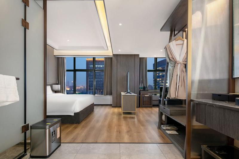 酒店坐落于郑州市郑东新区商务内环和商务东五街交叉口西新蒲大厦,北临郑州地标“大玉米”每晚可近距离全景欣赏“大玉米灯光秀” 。距郑州会展中心,如意湖畔,河南省艺术中心“大金蛋”仅一路之隔,参加会展,看一场话剧,听一场音乐会,散步中就到了,清晨可在如意湖边晨跑漫步,呼吸湖边的新鲜空气,又是美好的一天。 东临郑州交通重要枢纽郑州高铁东站,南边紧临郑州网红商场,“永威木色购物中心”,拍照、休闲、购物、美食尽在其中;毗邻国泰财富中心步行2分钟内即可到达。西边还有大型购物商场丹尼斯1-7天地,步行约5钟就可到达,也可乘坐商务内环免费便民车直达丹尼斯商场。酒店距离郑州较有特色的熙地港购物中心约10分钟车程,公交地铁均可直达;距国贸360约15分钟车程到达,距曼哈顿商业广场约5分钟车程可到达,酒店交通非常便利,靠近地铁一号线与四号线的会展中心站,距离郑州东站乘坐地铁一号线途经四站约15分钟就可直达郑州东站候车大厅。距离郑州新郑国际机场可乘坐地铁2号城郊线或自驾一小时即可到达,去往郑州火车站约20分钟车程可到达郑州火车站西进站口。还可乘坐一号线直达郑州地标性建筑二七广场观看二七纪念塔。 酒店有可容纳120人会议的高档会议室,舒适的早餐厅、和独立的茶室,自助洗衣房,挑高的大堂咖啡休闲吧书吧。酒店房间全部为智能化智慧客房。手机远程一键控制房间所有场景,语音控制房间灯光.窗帘.空调.电视.电视投屏等不同智能场景,能听懂你的声音,清晨早起,唤醒明亮模式,灯光窗帘打开,满满活力;午后语音打开窗纱,沏上一壶香茶,盘坐窗边踏踏米上,看着窗外大玉米的景色,一个怡人的下午,晚上携手心爱的人看一场大玉米的灯光秀后,呼唤睡眠模式,全部灯光关闭,窗帘、窗纱电动关闭,酣然一场好梦!