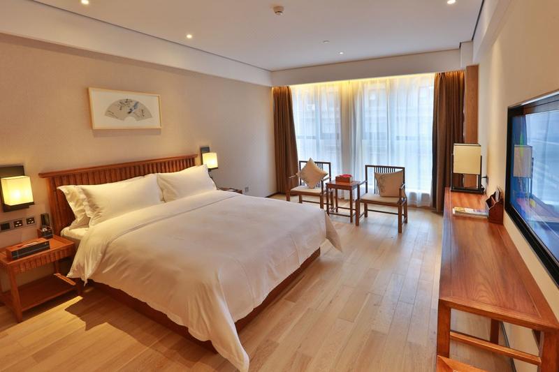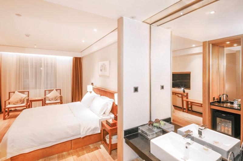 酒店位于金成时代广场,距郑州CBD会展中心、郑州市艺术中心、丹尼斯七天地、熙地港仅隔一条中州大道,距离地铁5号线姚砦站C口约步行2分钟,周边毗邻河南省人民医院,河南省肿瘤医院。 这是以禅茶文化与中式装修完美结合的新中式禅意酒店,古朴典雅、独具匠心。将茶文化、书文化、香文化、禅乐心经、素语餐厅等创造成一个人文、社交、格调相融的静心氛围,为顾客营造缓解压力、静心达意的精神体验。 酒店设有书画室、茶室、健身房、素语餐厅、宴会包房、自助洗衣等设施,客房提供全天候的热水供应、中央空调、WIFI覆盖、百兆光纤、分离卫浴、直饮水吧、房间小书吧,也打造了河南酒店行业目前完备、先进的智能化控制系统,从灯光、电器、窗帘乃至开门都可以实现微信控制,同时提供营养早餐、旅游、商务、洗衣等便捷服务。独立停车场,每一个细节均彰显人文关怀。温馨静雅的客房,只为你体验“祥净·无隅·品质生活”。