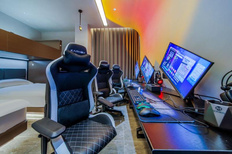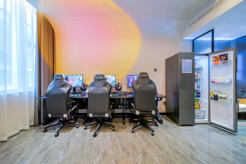 酒店介绍:为战而生,拯救热爱”本店是集团的总店,本店位于郑州市繁华的商业街---健康路,地理位置佳,且临近多个商业圈。 【酒店硬件设施】酒店使用的都是品牌中央空调、品牌电脑配置及外设,品牌投影,智能化防雾化妆镜、电动窗帘、中央热水系统,客房摆放双开门大冰箱、配备usb插口,床头可调节氛围灯等。 【酒店特色-大厅】酒店大厅的灯光造型采用外太空的设计更加渲染电竞的氛围,公区大屏幕实时转播各种赛事,摆放了内置1000多种小游戏的游戏机 【酒店特色-客房】酒店拥有舒适客房,二到六人间房型均可满足电竞宾客的各种喜好,电脑配备两种不同品牌鼠标供您选择使用。房间放置了品牌电竞椅,舒适度极高。客房采用智能化弱电系统及电动窗帘,电脑用电24小时不间断,拔掉房卡也不断电,中央热水系统10秒出热水,装有智能化防雾化妆镜,客房放置多个一次性纸杯干净卫生,睡衣、一次性拖鞋独立塑封包装干净又卫生。配备了智能小度管家,投影仪,部分四人间五人间和所有六人间都带有麻将机,主宣了你的娱乐项目