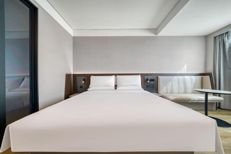 汉庭3.5旗舰店引入了意大利原装进口家具、客房智能语音系统、兼具无线充电的床头柜等亮点。整个公区采用莫兰迪配色,拼接色彩丰富却看起来和谐舒适。大堂圆弧式的全景设计,干净利落的线条,让整个大堂美而不累赘。我们由衷的希望,用品质出行丰富你生活的骨感,让你即使在路上,也能品味生活的美好,远离疲惫喧嚣,汉庭新品3.5,期待您的光临!