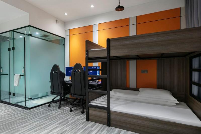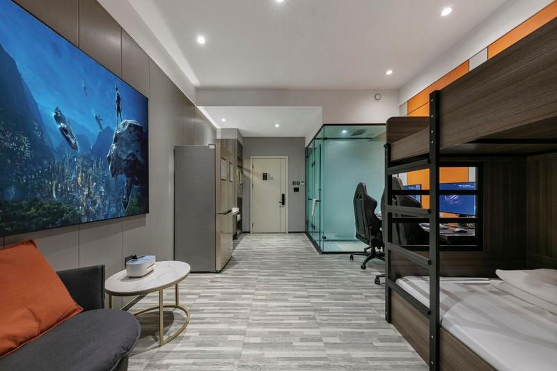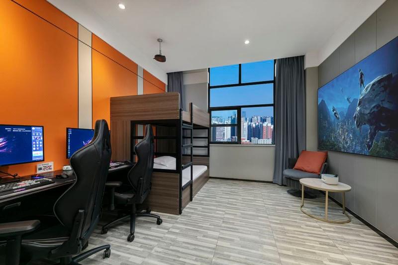 酒店是电竞酒店中的一匹黑马,全系采用酷睿i9处理器、ROG系列显卡、2K165hz显示器!是一家集高端电竞、品质服务、休闲娱乐、聚会轰趴于一体的多元化酒店。所有客房均拥有“小步”智能一体化客控系统,简单口令操控窗帘、灯光、中央空调、投影等电子设备。酒店采用新一代AI智能机器人,为您提供更优质的送餐、送物、取快递、迎宾接待等服务。部分房间带有乔氏台球、VR体感游戏、大型街机等多种设施。这里有豪华双床、云端大床、三人、四人、五人、六人、轰趴套房等多种选择。这是一家高配置、高颜值、高规格的“三高”酒店。酒店提供迎宾小食、咖啡糖、贝德玛卸妆、女士护肤、睡眠眼贴、暖宝宝、自助洗衣、停车等多项服务。本店是您聚会娱乐的理想选择!我们致力为每一位客人提供更好的入住体验。