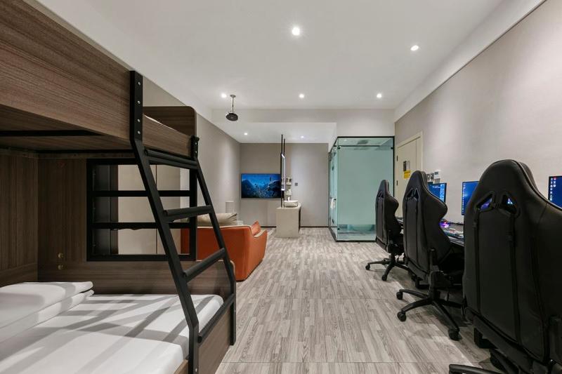 酒店是电竞酒店中的一匹黑马,全系采用酷睿i9处理器、ROG系列显卡、2K165hz显示器!是一家集高端电竞、品质服务、休闲娱乐、聚会轰趴于一体的多元化酒店。所有客房均拥有“小步”智能一体化客控系统,简单口令操控窗帘、灯光、中央空调、投影等电子设备。酒店采用新一代AI智能机器人,为您提供更优质的送餐、送物、取快递、迎宾接待等服务。部分房间带有乔氏台球、VR体感游戏、大型街机等多种设施。这里有豪华双床、云端大床、三人、四人、五人、六人、轰趴套房等多种选择。这是一家高配置、高颜值、高规格的“三高”酒店。酒店提供迎宾小食、咖啡糖、贝德玛卸妆、女士护肤、睡眠眼贴、暖宝宝、自助洗衣、停车等多项服务。本店是您聚会娱乐的理想选择!我们致力为每一位客人提供更好的入住体验。