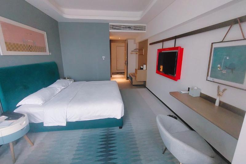 新乡艺悦酒店是宝龙酒店集团推出的艺术主题连锁酒店,酒店以文化艺术为品牌核心价值,倡导“品味艺术、悦享生活”的服务理念,地处新乡市政治文化中心,紧靠新乡宝龙城市文化广场,比邻新乡博物馆、新乡高铁站等,周边配套设施一应俱全,交通便利。酒店总面积8437.9㎡,共10层,整体设计以新乡市花“石榴花”这一文化符号出发,通过趣味横生的创意风格和大胆浪漫的色彩搭配进行艺术化演绎。共设有165间(套)艺术客房,整体精致考究,舒适惬意,采用多圆弧造型结构设计,运用象征温柔优雅的复古蓝色,搭配精心甄选的全球新锐艺术家画作,呈现简约时尚的家居装饰风格,营造轻松、自然且充满趣味性和艺术感的美妙休养空间,可满足宾客商务和休闲居住的不同需求。同时配备3个多功能会议厅,以线型灯槽营造前卫时尚感,满足多元化的会议需求;并设有不同艺术风格主题包厢的味美中餐厅及时尚雅致、极尽现代简约之感的全日制餐厅,让宾客在浓厚的艺术氛围中畅享美味。酒店还邀请国内外知名艺术家驻地创作,并定期举办主题艺术展览,让宾客零距离与艺术家交流,营造集艺术画廊、艺术欣赏、艺术交流为一体的全新“酒店”+“艺术”的休闲体验空间。