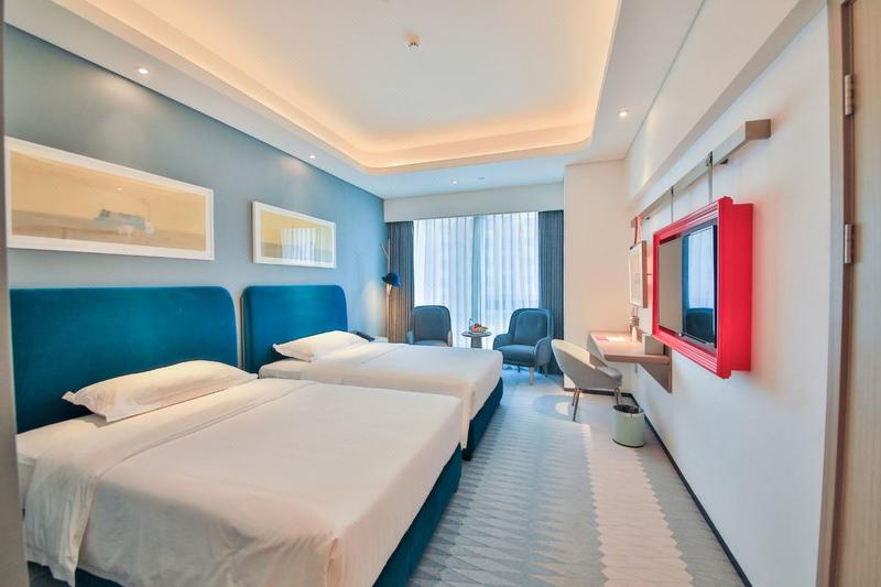 新乡艺悦酒店是宝龙酒店集团推出的艺术主题连锁酒店,酒店以文化艺术为品牌核心价值,倡导“品味艺术、悦享生活”的服务理念,地处新乡市政治文化中心,紧靠新乡宝龙城市文化广场,比邻新乡博物馆、新乡高铁站等,周边配套设施一应俱全,交通便利。酒店总面积8437.9㎡,共10层,整体设计以新乡市花“石榴花”这一文化符号出发,通过趣味横生的创意风格和大胆浪漫的色彩搭配进行艺术化演绎。共设有165间(套)艺术客房,整体精致考究,舒适惬意,采用多圆弧造型结构设计,运用象征温柔优雅的复古蓝色,搭配精心甄选的全球新锐艺术家画作,呈现简约时尚的家居装饰风格,营造轻松、自然且充满趣味性和艺术感的美妙休养空间,可满足宾客商务和休闲居住的不同需求。同时配备3个多功能会议厅,以线型灯槽营造前卫时尚感,满足多元化的会议需求;并设有不同艺术风格主题包厢的味美中餐厅及时尚雅致、极尽现代简约之感的全日制餐厅,让宾客在浓厚的艺术氛围中畅享美味。酒店还邀请国内外知名艺术家驻地创作,并定期举办主题艺术展览,让宾客零距离与艺术家交流,营造集艺术画廊、艺术欣赏、艺术交流为一体的全新“酒店”+“艺术”的休闲体验空间。