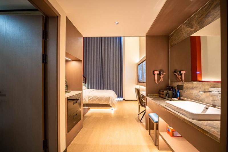 【酒店位置】坐落于漯河市郾城区会展中心黄山路与岷江路交叉口向西;与漯河会展中心一路之隔,西邻漯河食品职业学院、漯河五高、南临漯河日报社、丹尼斯综合商超、沙北幸福渠,东临漯河高中北校区、北邻MOCO美食街、漯河市人民检察院、中储棉漯河仓库。 【酒店设施】全智能小度语音操控,无需动手便可操控房间电视、灯光、空调、窗帘等设施。入住押金自动返、退房无需等待、随住随走。酒店客房采用现代轻奢装修风格,房间配备有办公桌,茶桌,茶具,正山小种茶叶/雀巢挂耳咖啡免费饮用,是您喝茶会友的不错选择! 【停车便捷】酒店有地上、地下停车场可免费停放。 【周边交通】距京港澳高速漯河北出口10分钟车程,漯河高铁西站13分钟车程,漯河火车站及市汽车中心站11分钟车程。 【周边美食】小白蒸鲜馆、千寻料理、广顺兴、那故事餐厅、悦伴融合餐厅、南水岸餐厅、淞江美食城小夜市等 【休闲娱乐】盛世名人KTV、紫晶城KTV、动岚梦工厂健身房、熊猫酒吧、金水桶浴足、玉洁足浴...... 【商超购物】楼下24小时便利店。丹尼斯综合商超满足您日常购物需求:水果、百货、服饰、电玩、特色小吃、电影等一应俱全 我们一直坚持为客人提供高品质的服务与设施设备,一切以客人满意为追求,让离家在外的您得到悉心的呵护与关怀!