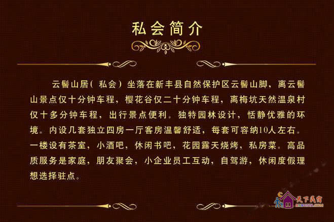 新丰云髻山居客栈位于韶关新丰县云髻山景点2公里,樱花谷十多公里看雪,西距云天海温泉10公里,西北距新丰江源温泉8公里,出行景点方便。内有三套四房一厅优雅舒适套房,每套可容纳10人左右,套房家电家具齐全,且配有麻将桌台给顾客娱乐,房间按星标准配置。南向的客厅阳台远可望田园风景,近可望院内人造石山、小桥流水、绿树小草鲜花。一楼设有城乡结合的宽敞厨房(可自厨食物),自助茶室,小酒吧,休闲书吧,花园露天烧烤,提供住客使用。也可定制本地特色美食,是家庭、自驾游、朋友聚会休闲度假的理想选择驻点。