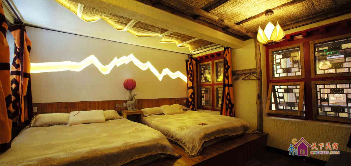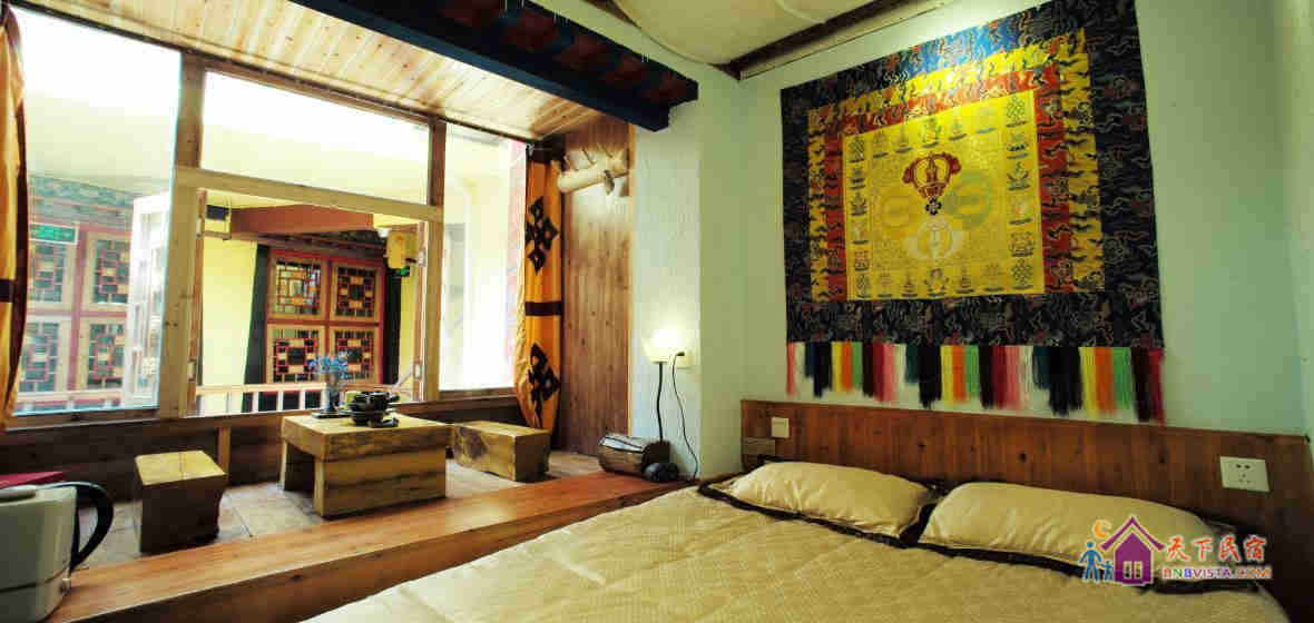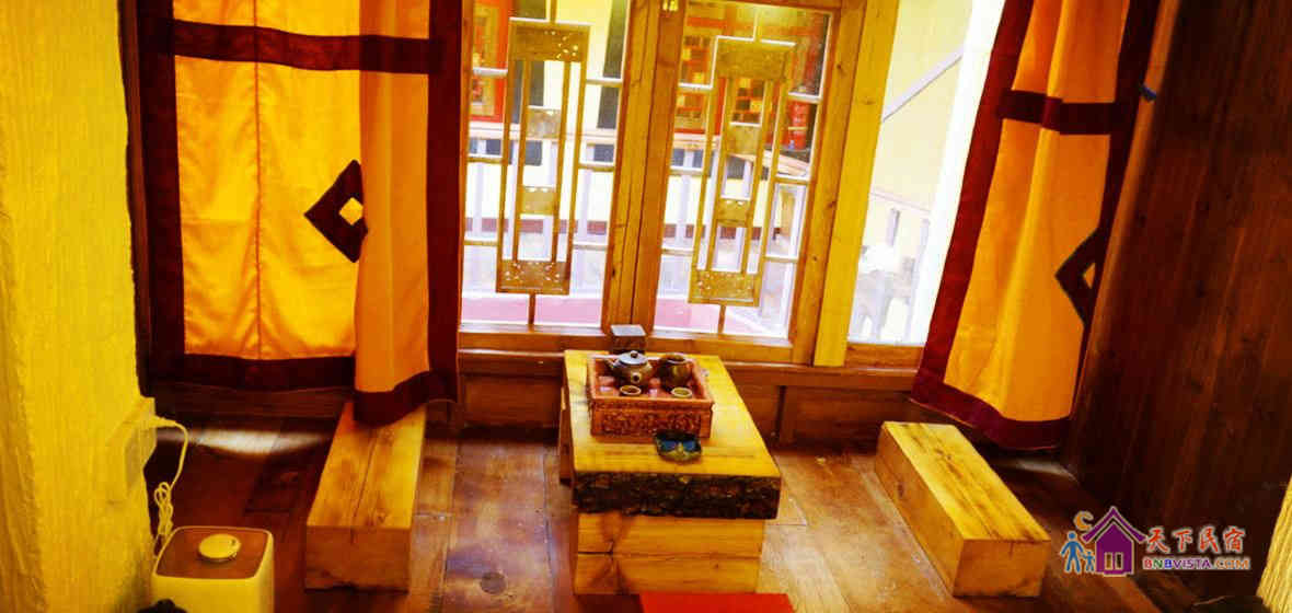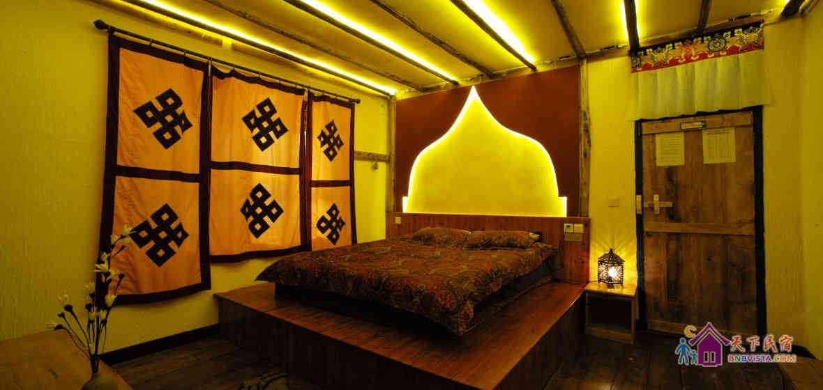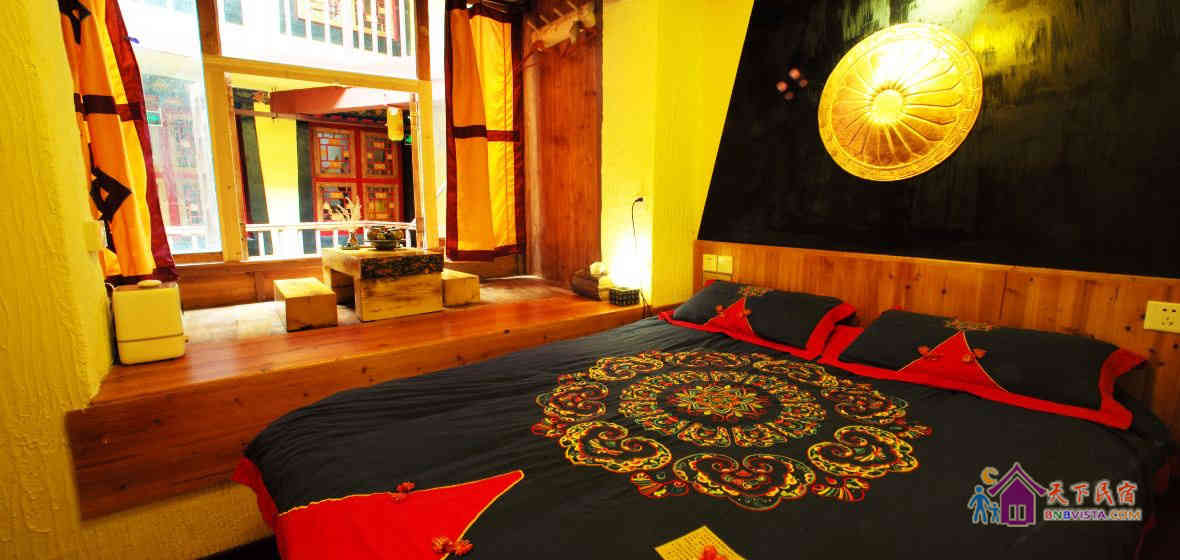客栈房间不多,但每间房都做了藏式特色的主题设计。主色调选用最代表西藏的喇嘛红和暖黄色,无论你着装素雅亦或艳丽,在店内的上镜效果都非常出色并具有浓厚的民族特色。房内床铺采用高端纯棉贡缎,冬季提供暖气。