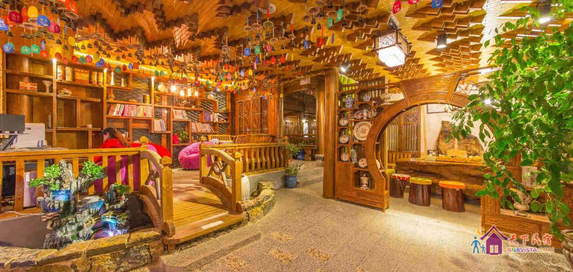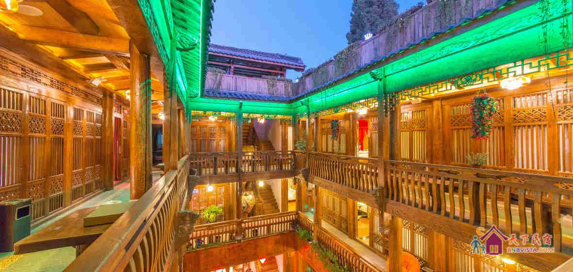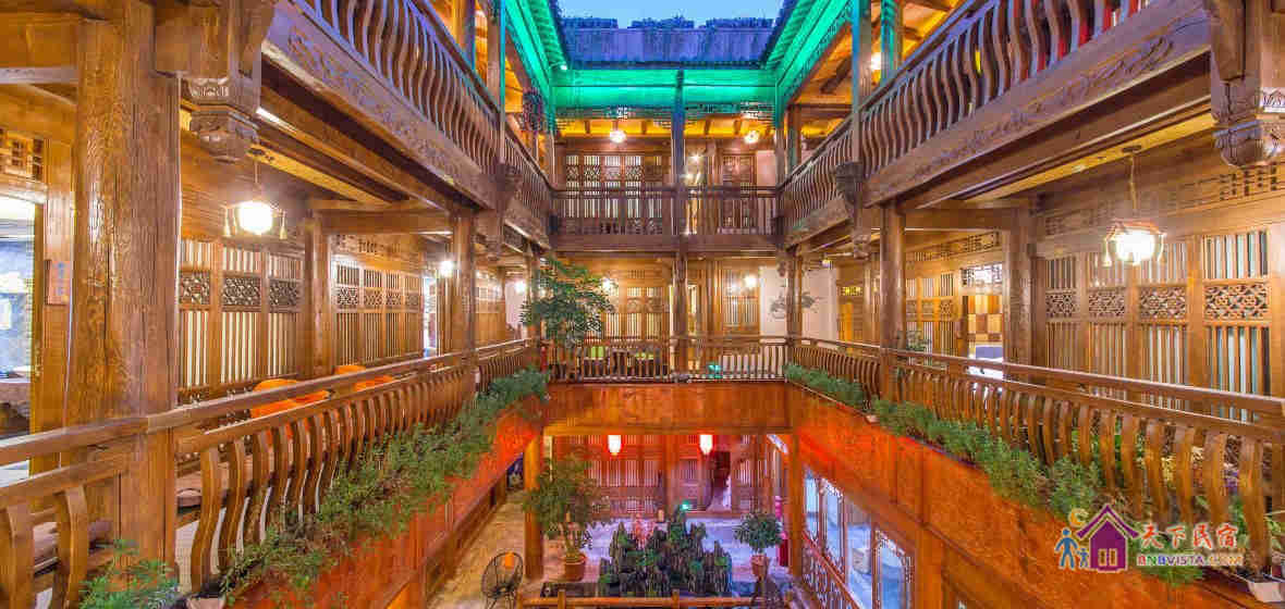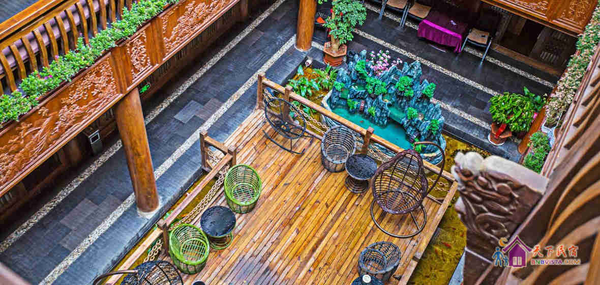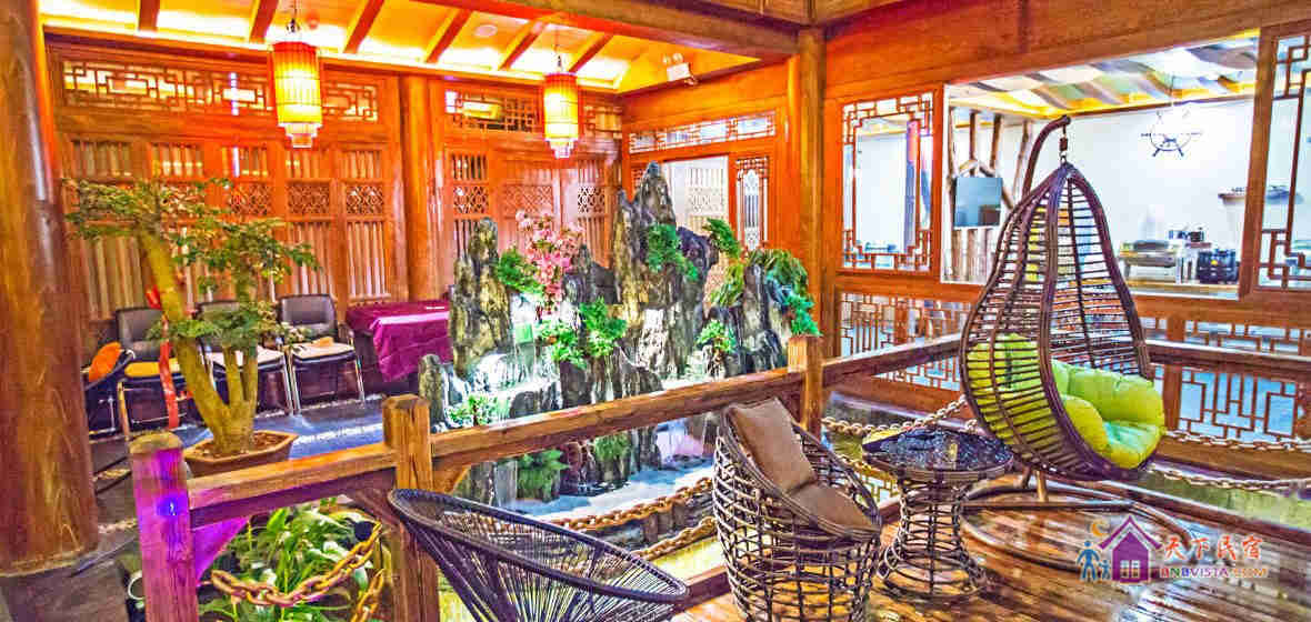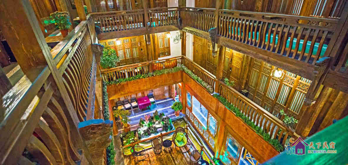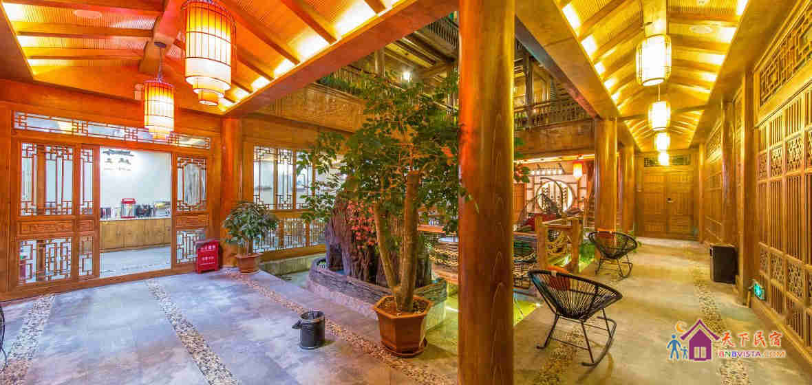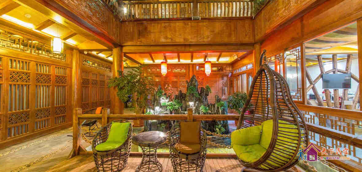 客栈以经典的纳西族“三坊一照壁,四合五天井,走马转角楼”的庭院样式为基础,穿插现代化设计理念,回字形上下三层结构,花草遍地、阳光充足。院内中庭为客人休息区,台湾大厨风味的早餐、新鲜水果、晚上还有甜点赠送,提供KTV房,前台和休闲喝茶区域融为一体。