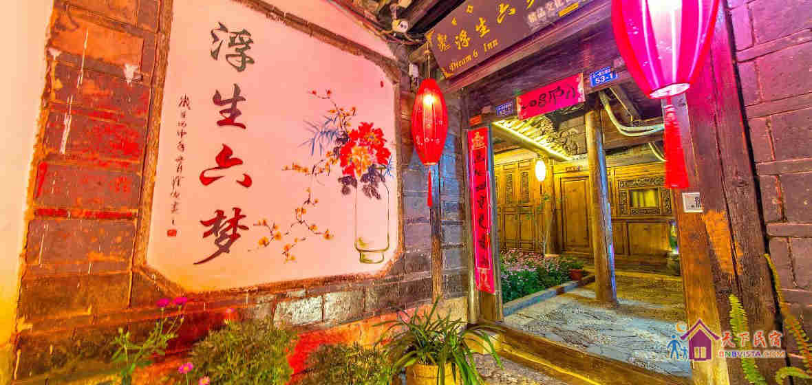 丽江浮生六梦居客栈位于丽江古城五一街王家庄巷(纳西喜院斜对面),位于古城里一个闹中取静的地段,结庐在人境,而无车马喧。客栈离四方街步行十分钟距离,离丽江主街五一街、七一街步行两三分钟距离,客栈附近为丽江音乐人比较集中的聚集地,一箭之地,尽聚丽江情调酒吧,杨柳依依,小桥流水,文艺气氛浓厚。