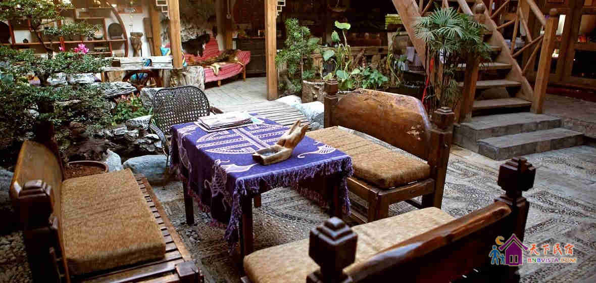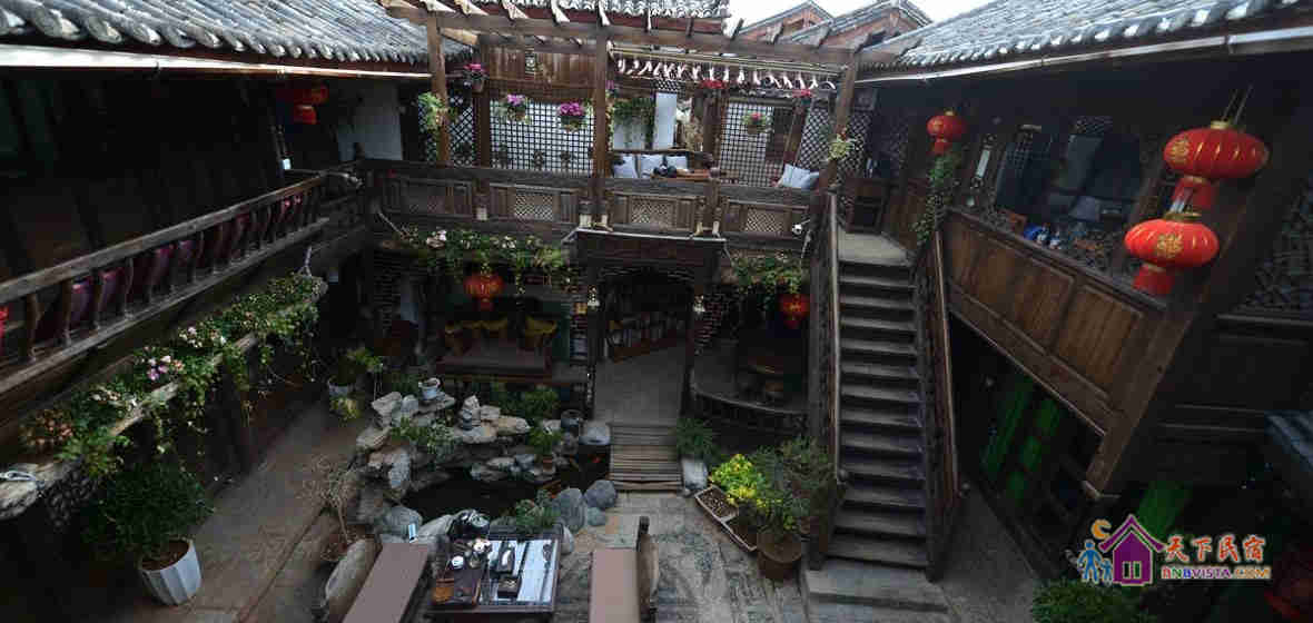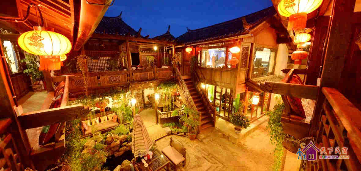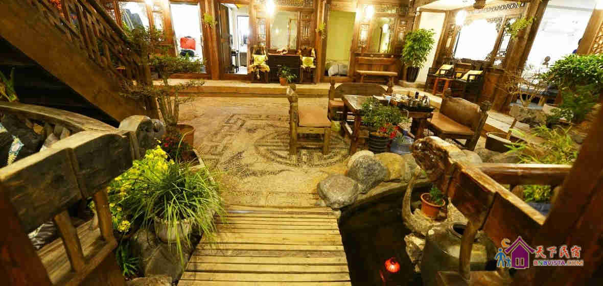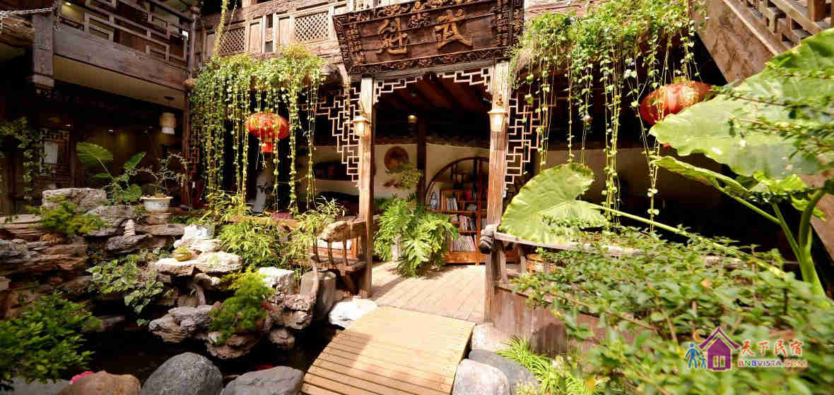 客栈外墙爬满的嫣红三角梅,远远看去似一树繁华,高高挂着的大红灯笼,在微风中把一切温暖过往收入眼底,门廊走道上方成片风铃像一道彩虹,轻风吹过,叮叮当当,悦耳动听,图案雅致的鹅卵石地面,蔓延的藤蔓,水池中悠游的金鱼,青石的假山,在洒满阳光的茶室,喝一盏回味深长的普洱,雅案上的古筝,缓缓流淌出古老的弦音,这里浓郁的人文气息,古朴而典雅。