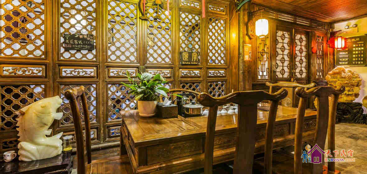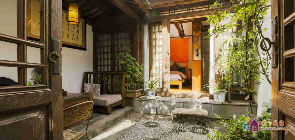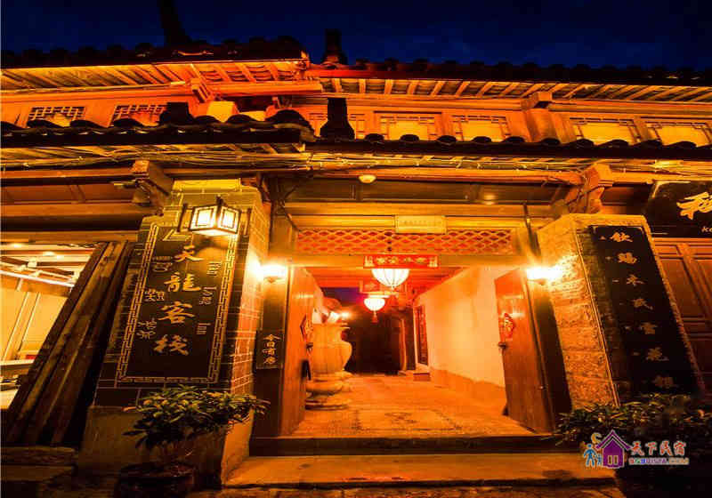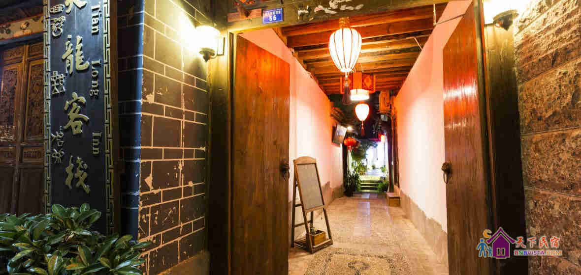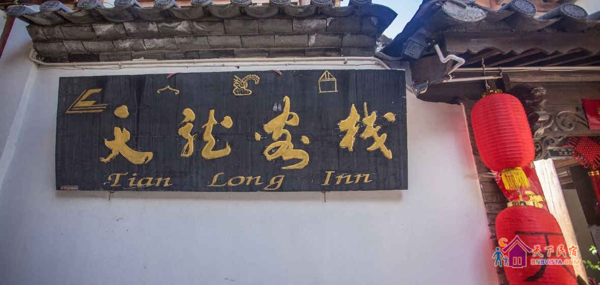 丽江天龙客栈位于木王府正对面,左依徐霞客题词照壁,右靠纳西木土司亲笔所题的“天雨流芳”牌坊;门前小溪潺潺而过,地理位置得天独厚。