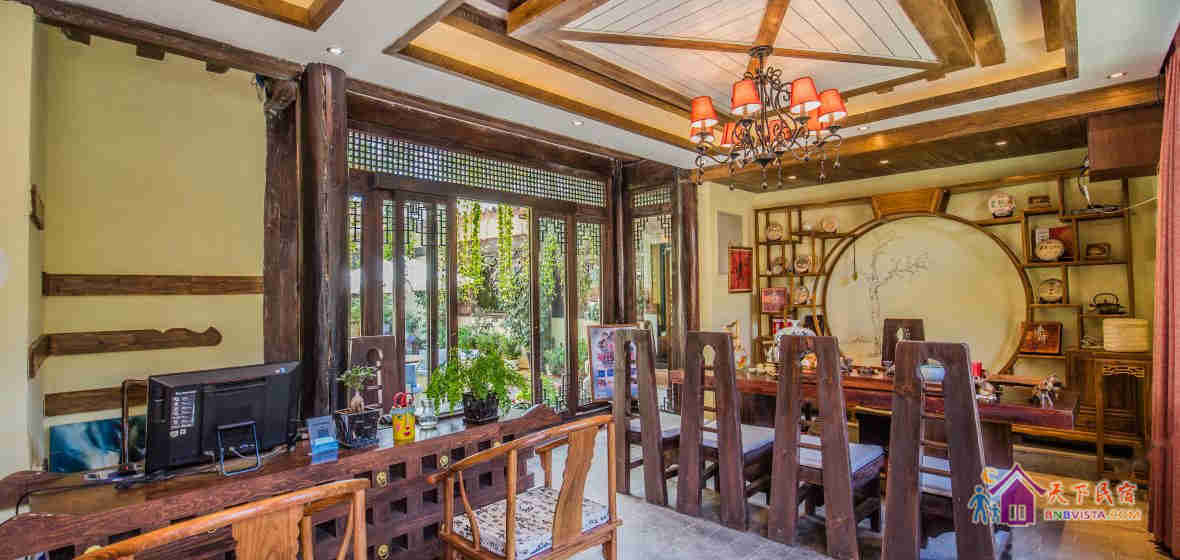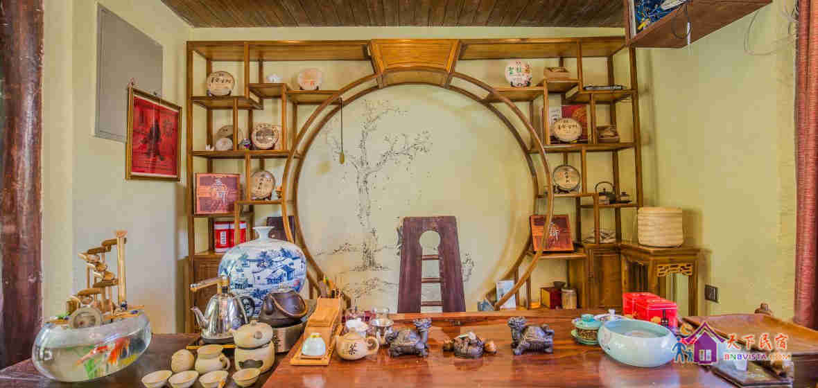客栈里有个古朴的溪旁纳西小院,墙上的壁画也画得很有味道,品茶区也布置得很雅致,令不喜喝茶的人都忍不住要去喝一杯。