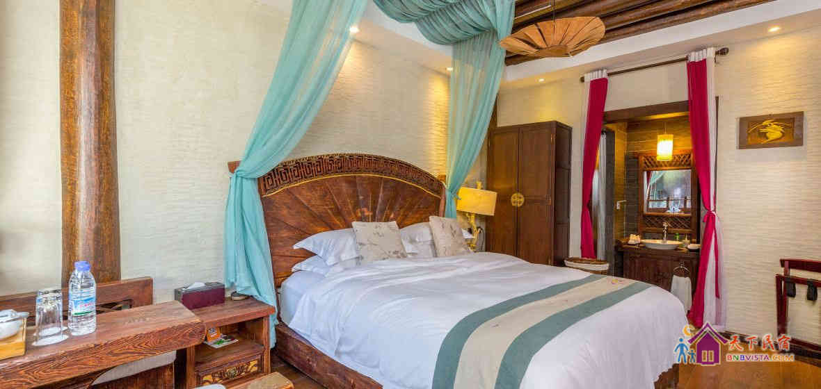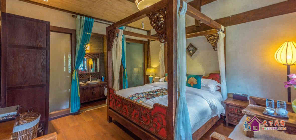 私人订制的实木包铜家具源自台湾设计师手笔,实木包铜雕花的大床和案几,古朴富有质感,还有慕思床垫、鸭绒丝织床品、泰国特色仿古灯饰。