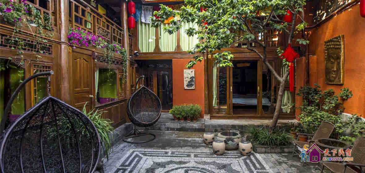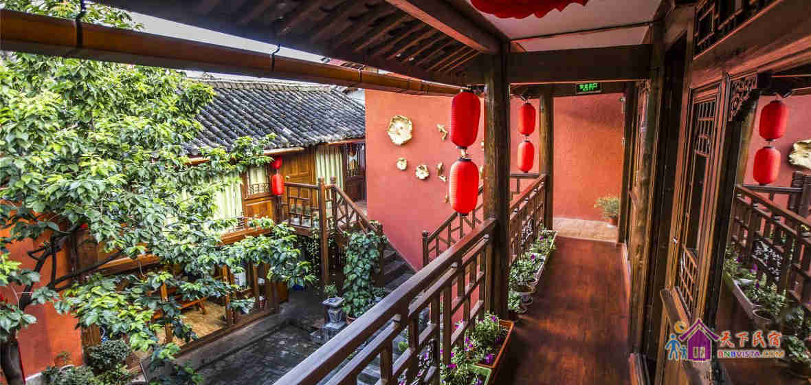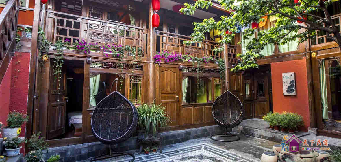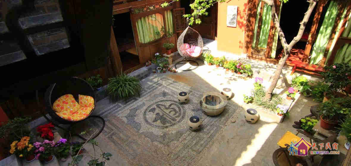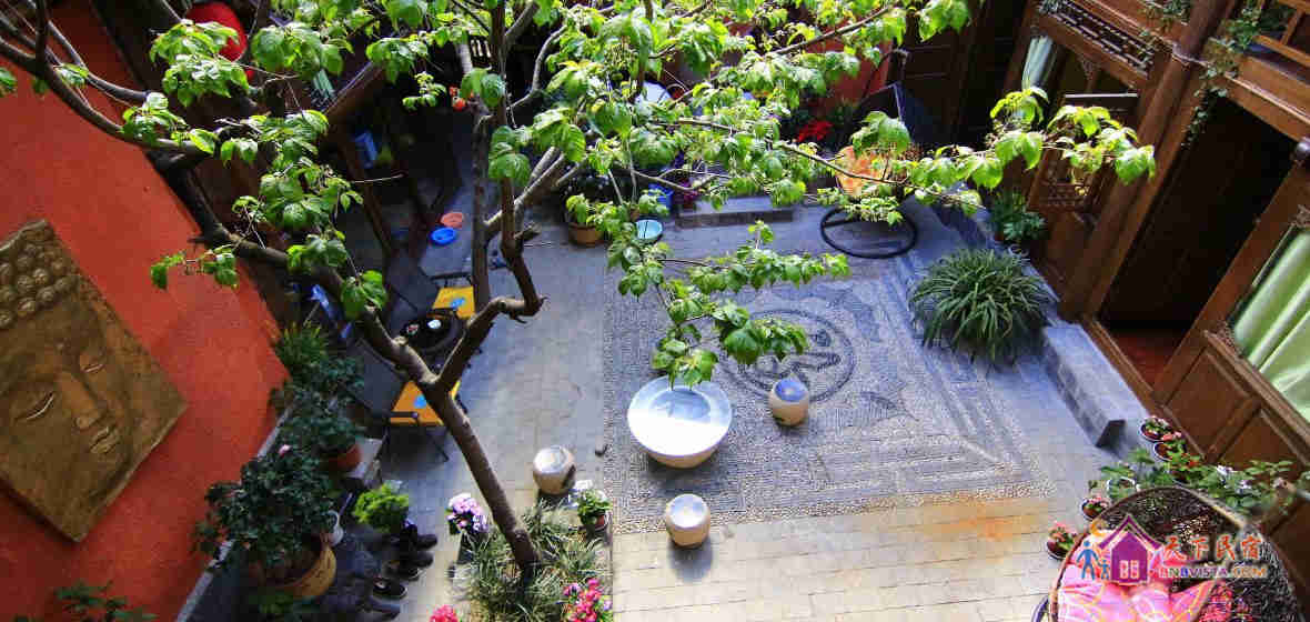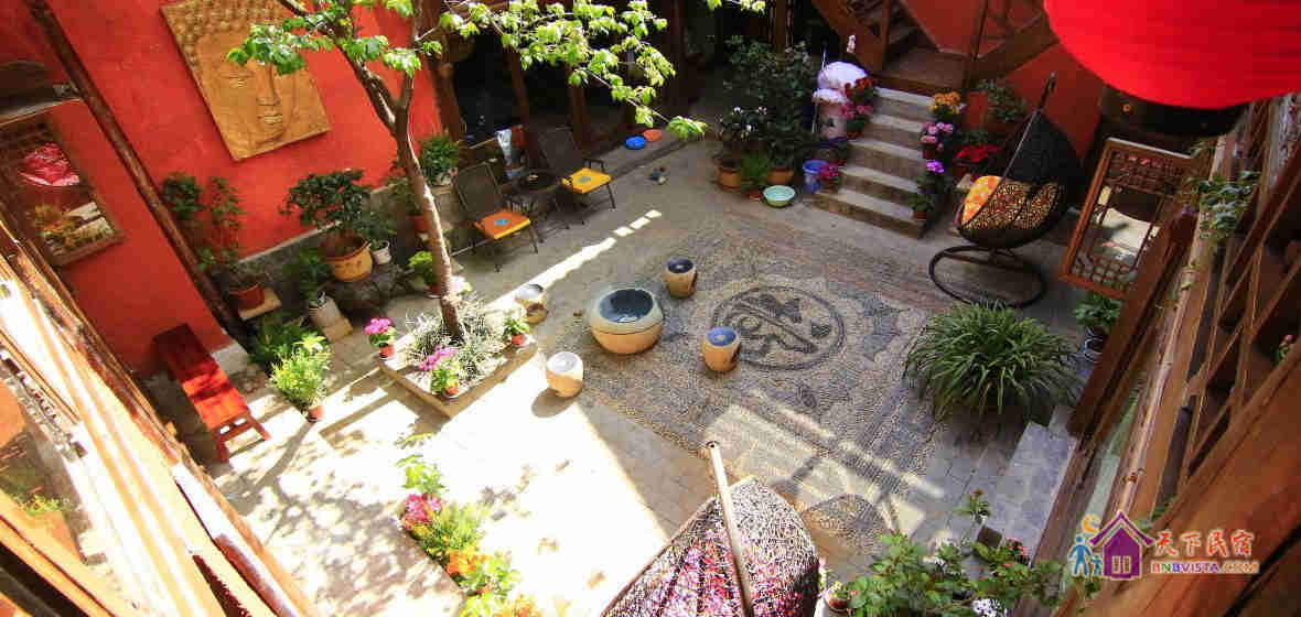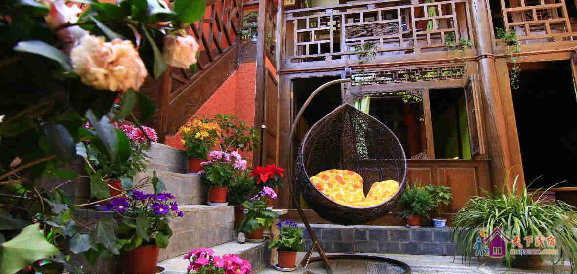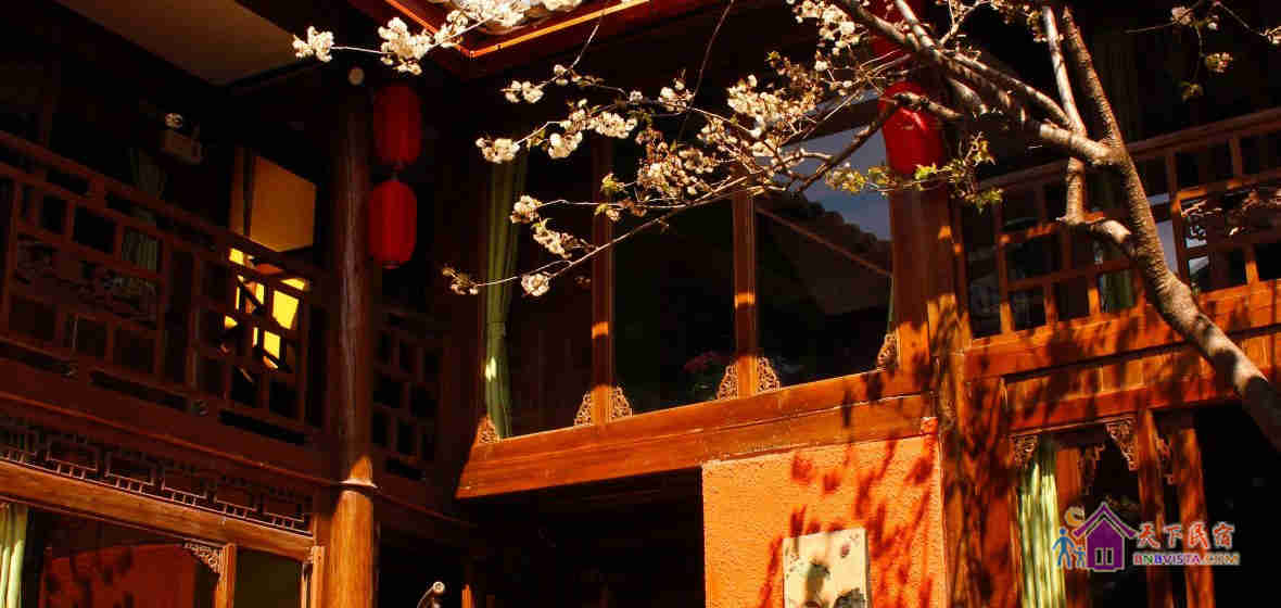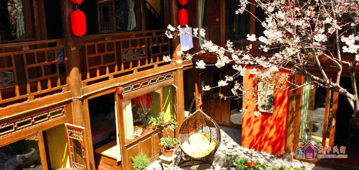 这是一个充满纳西风情的小院儿,有着高高的樱桃树。你可以在传统的二层木质结构纳西庭院内,感受碧空、艳阳。