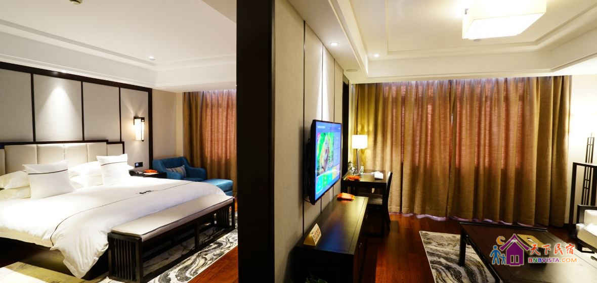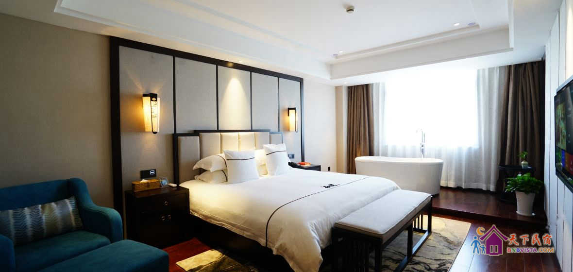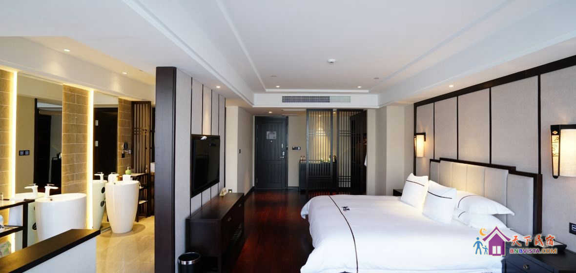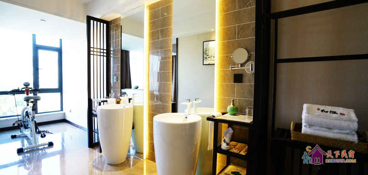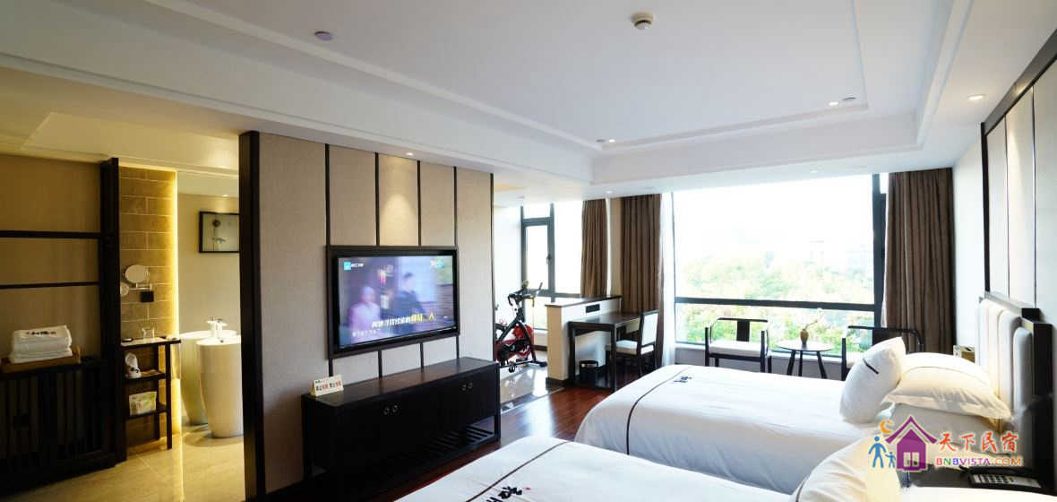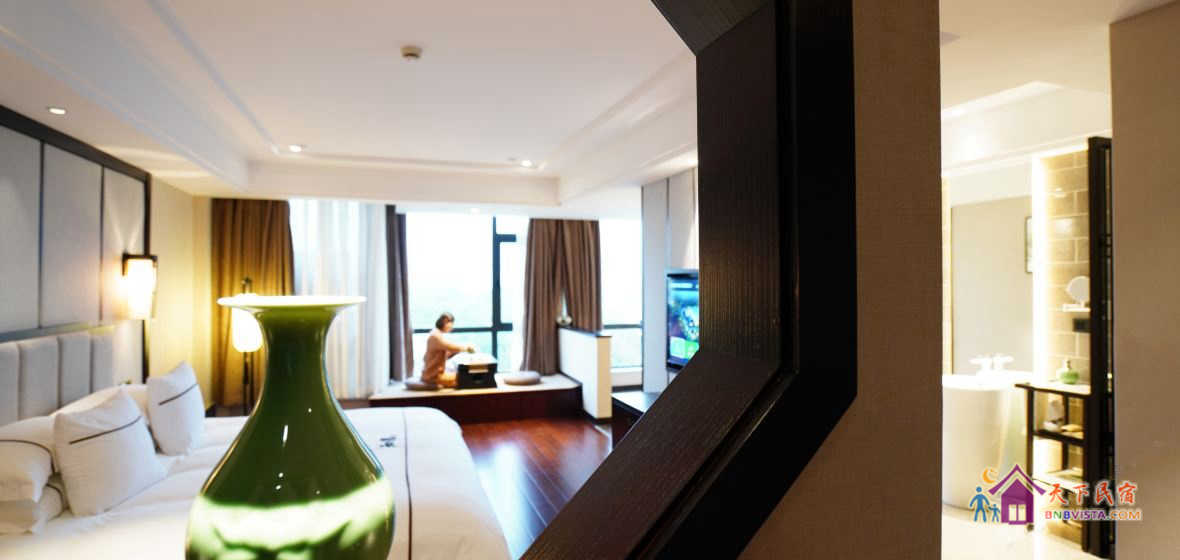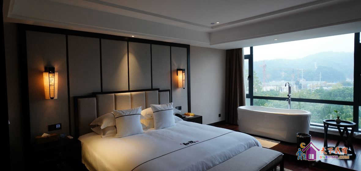 步入客房,空间宽敞,布局特色,装饰艺术,并配备动感单车、浴缸、慕思床垫,同时智能化的灯光、空调、音箱、窗帘,让你体验现代科技带来的便利和舒适。驻足在落地窗前,远处的青山,近处的绿树,让你“悠然见南山”。