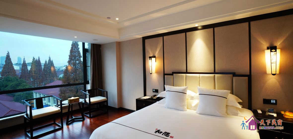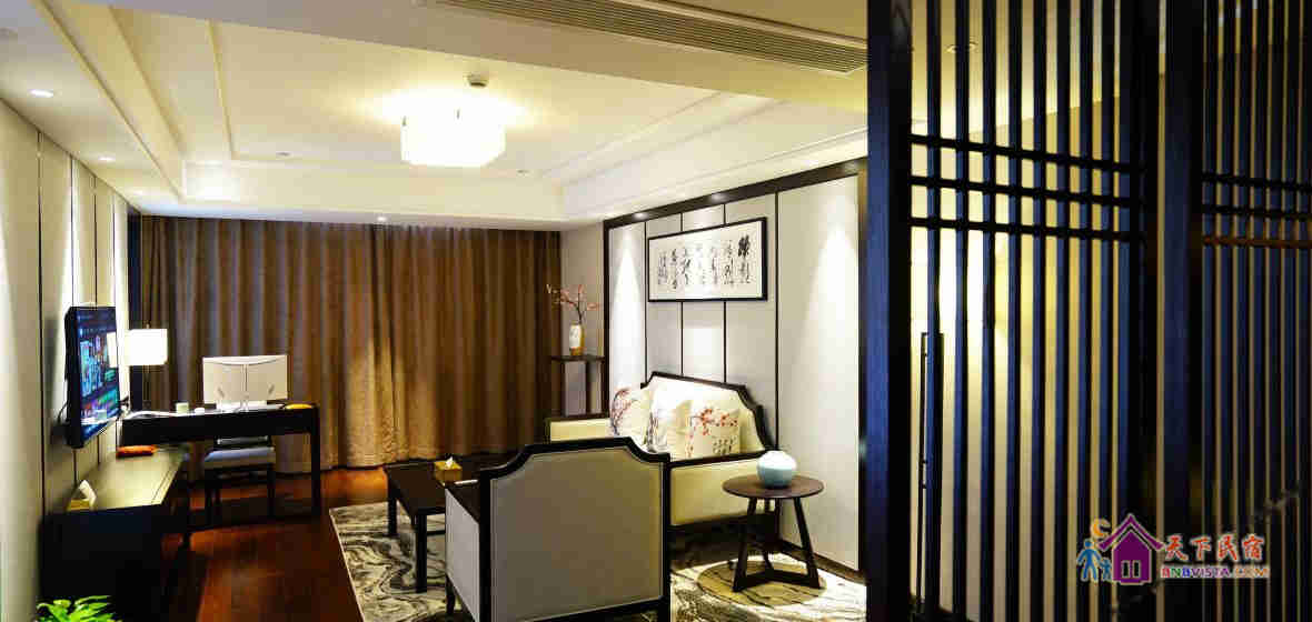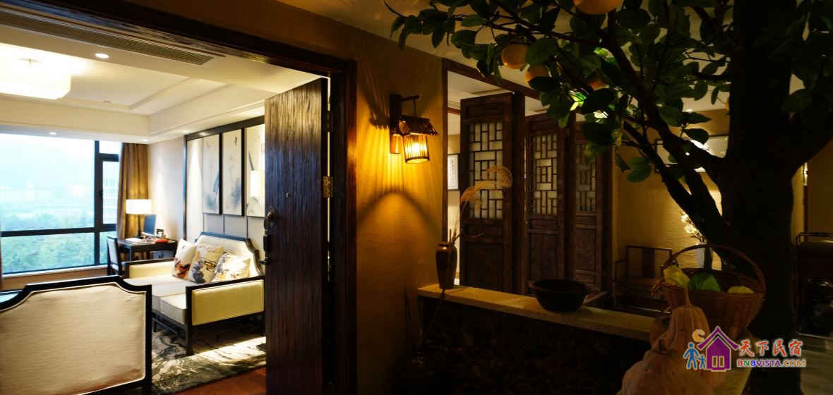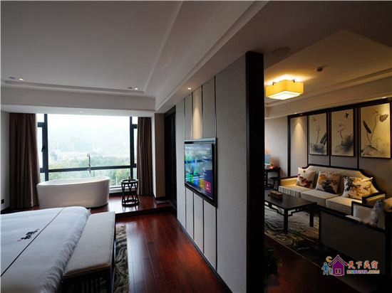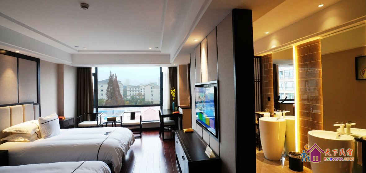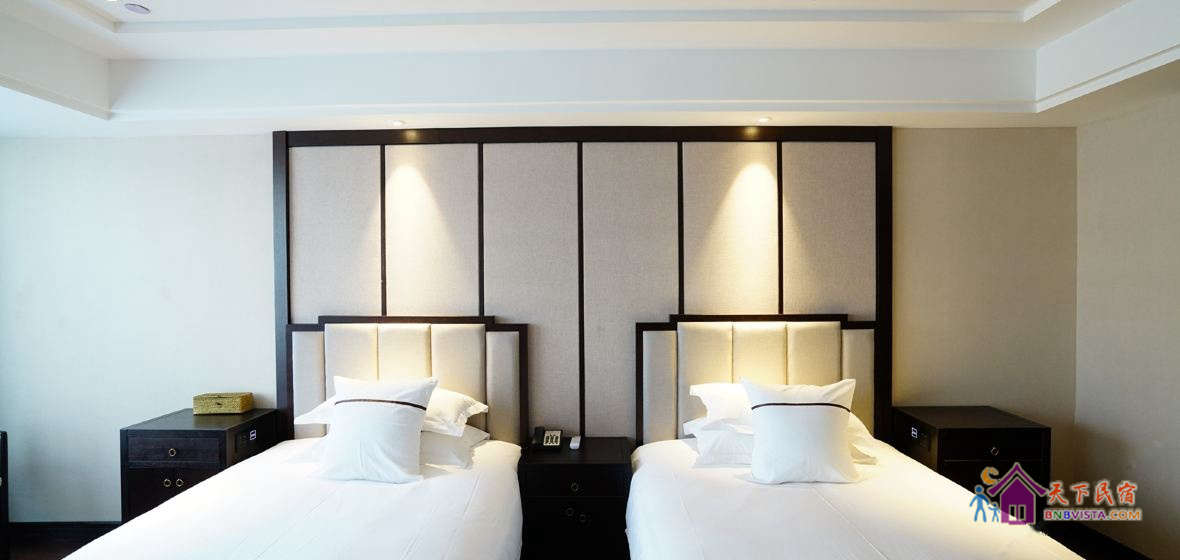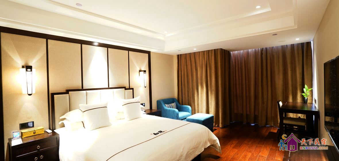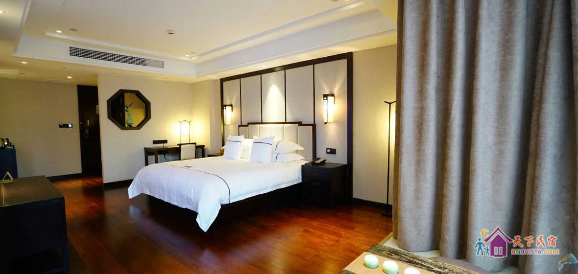 步入客房,空间宽敞,布局特色,装饰艺术,并配备动感单车、浴缸、慕思床垫,同时智能化的灯光、空调、音箱、窗帘,让你体验现代科技带来的便利和舒适。驻足在落地窗前,远处的青山,近处的绿树,让你“悠然见南山”。