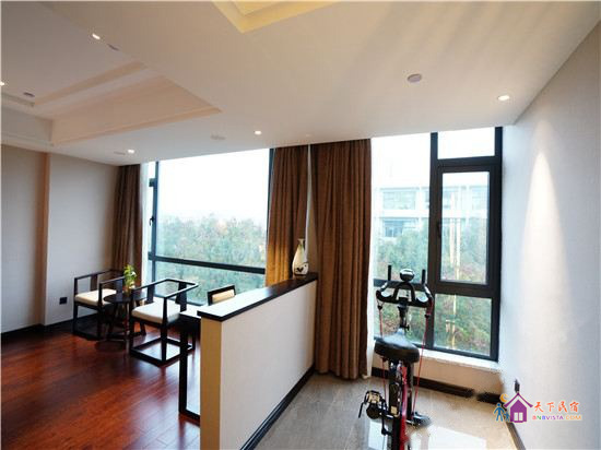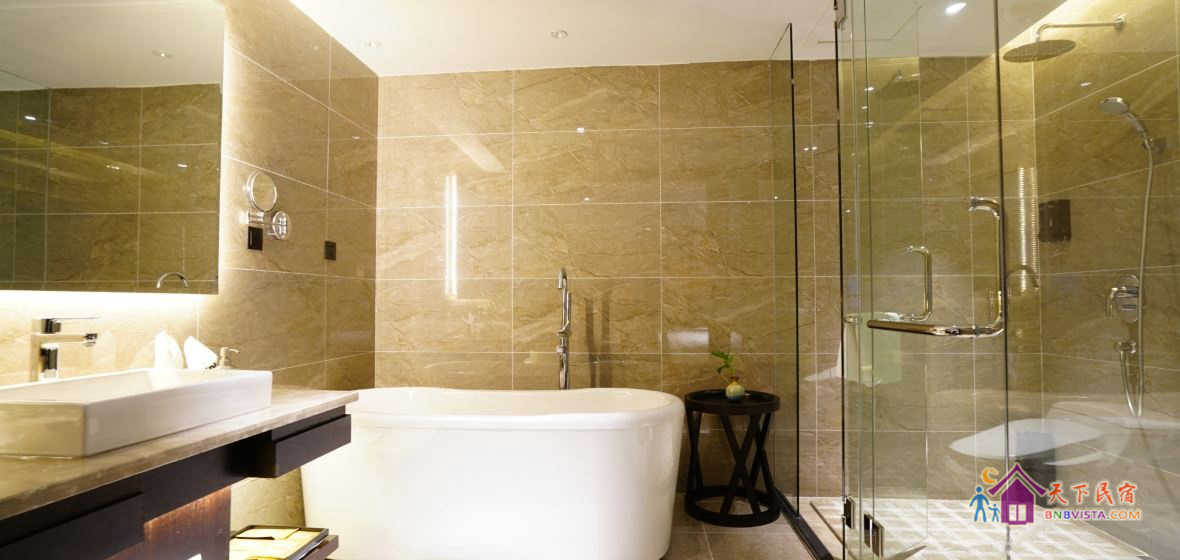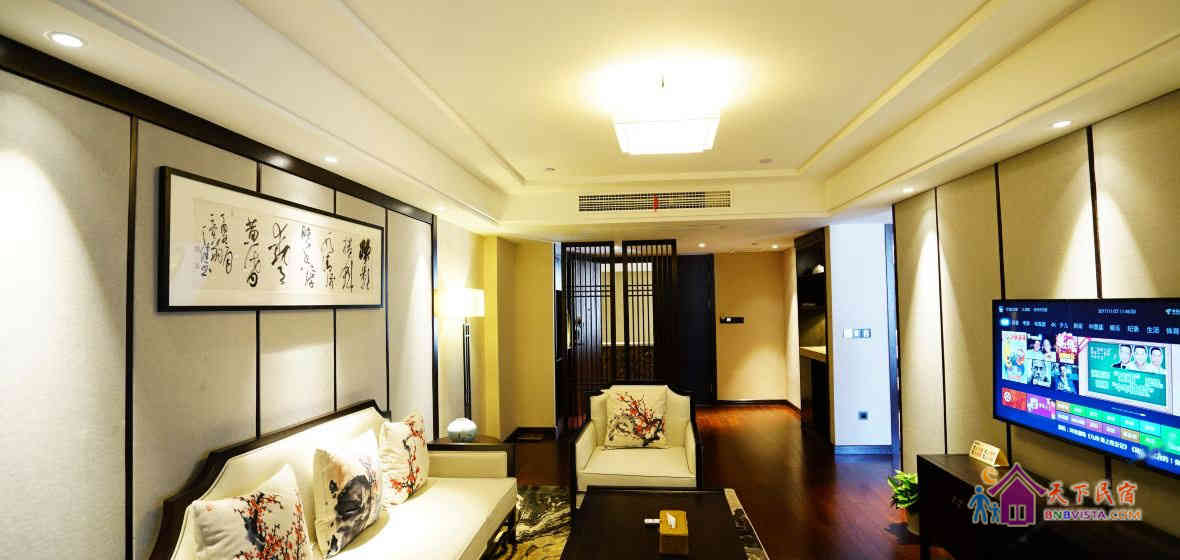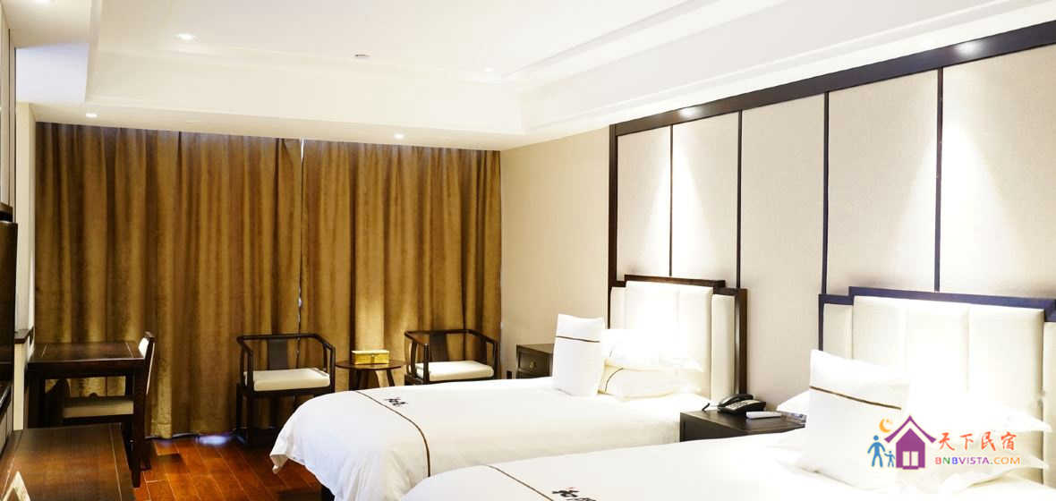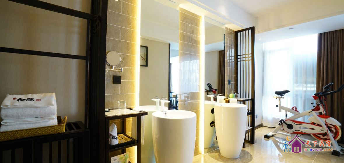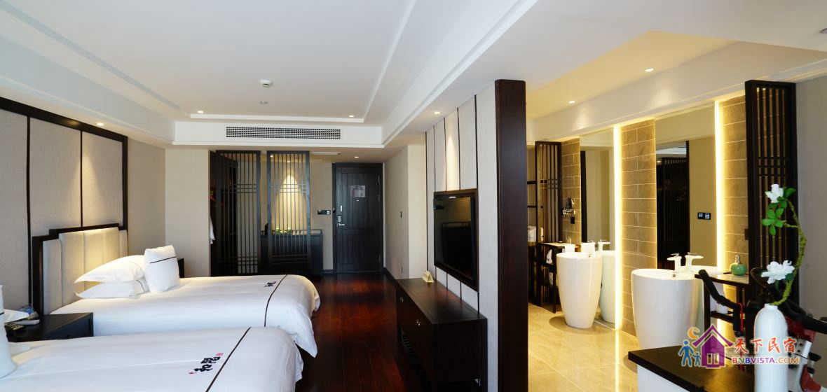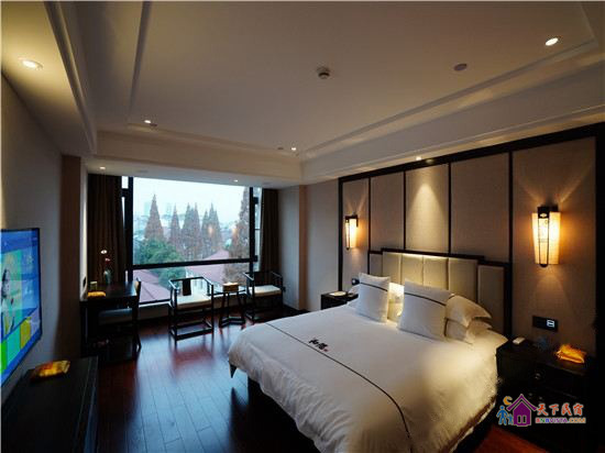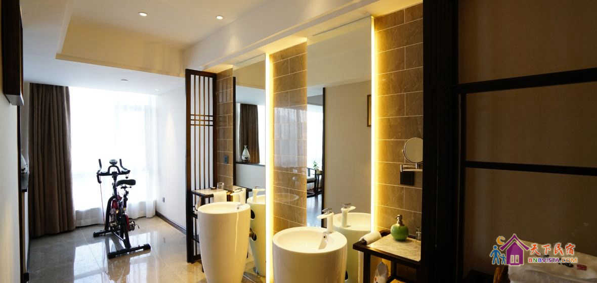 步入客房,空间宽敞,布局特色,装饰艺术,并配备动感单车、浴缸、慕思床垫,同时智能化的灯光、空调、音箱、窗帘,让你体验现代科技带来的便利和舒适。驻足在落地窗前,远处的青山,近处的绿树,让你“悠然见南山”。