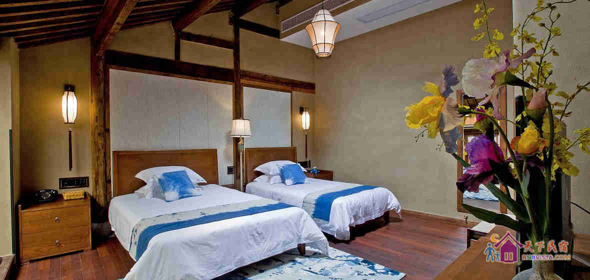 客栈是由资深旅游和设计业者耗时两年,耗资千万呕心沥血精心打造之作,由四幢徽派老宅(承敬堂、味籣居、喜舍、徽膳堂)和园景水榭组成的院落组合改造而成,鸟语花香,景致宜人,尽显徽派古朴与文化的奢华。