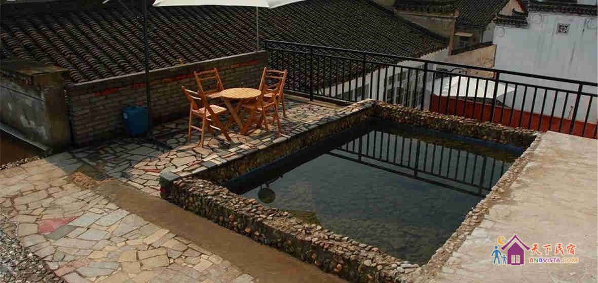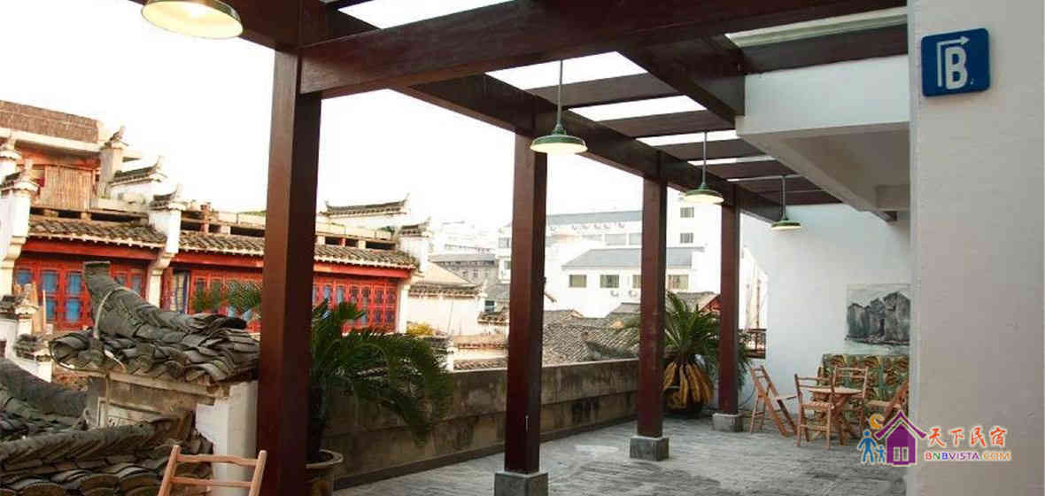 旅舍以临街的徽派建筑为主体,门口可通行汽车,拥有小型泊位。在极其特色的楼台,马头墙的徽派建筑为外观的基础上,按照现代,新锐的设计理念,内部进行了各种视觉反差,融合的色彩与结构设计。豪华间,标准间,经济间等各类客房,每个房间都提供宽带上网服务。公共区域丰富多彩,客房区内有共计260平方左右的玻璃顶茶座,室内聊天室,2个露天休闲茶座酒吧与小型艺术展示中心,专业摄影棚,画室,乒乓球室。各种设施俱全。
