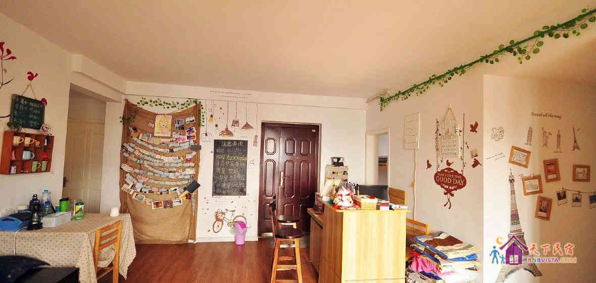 杭州笑笑青年旅社位于顶楼,站在家里就可一览众山小,三个阳台,还带一个顶楼,小区里还有古井王家井,这历史,这文化,当然还有篮球场,随时可以来个篮球对决。最重要的是为了配合杭州的美景,笑笑的青旅走的是宜家清新简单大方的风格,全新的床上用品、小资小调的书架、沙发、24小时热水、全阳台绿色植物、宜家墙绘、20兆无线网、超宽敞公共区域。