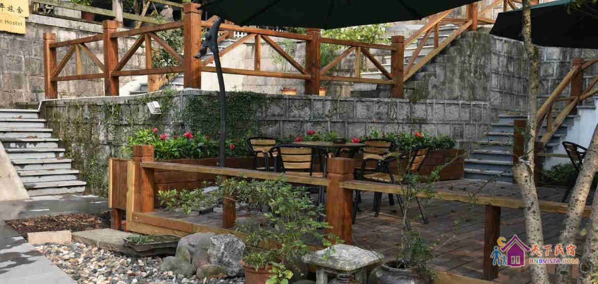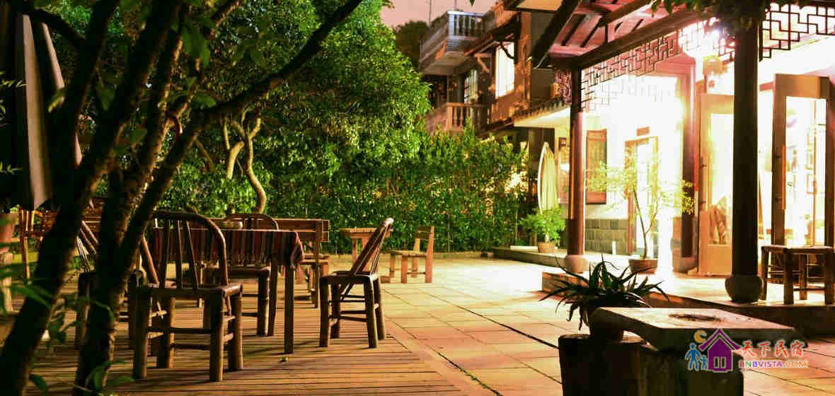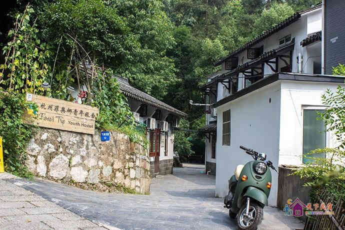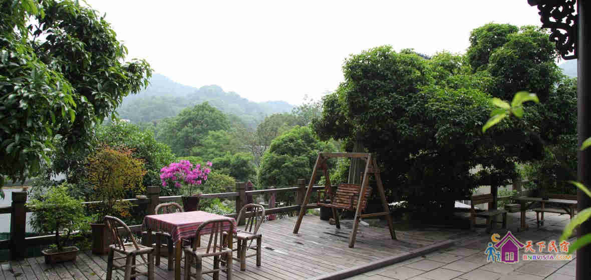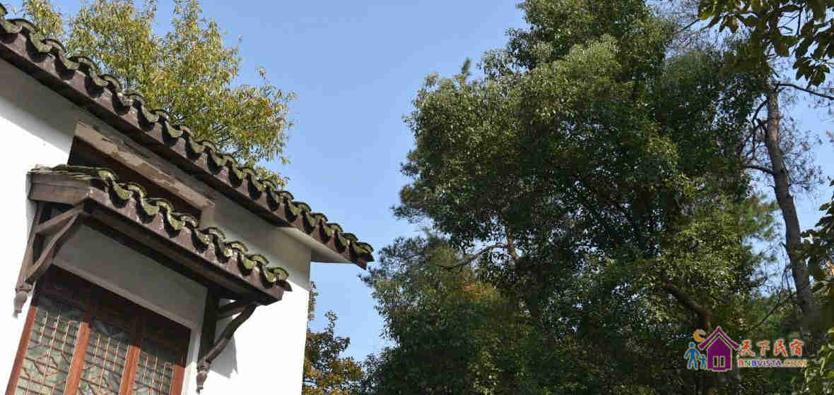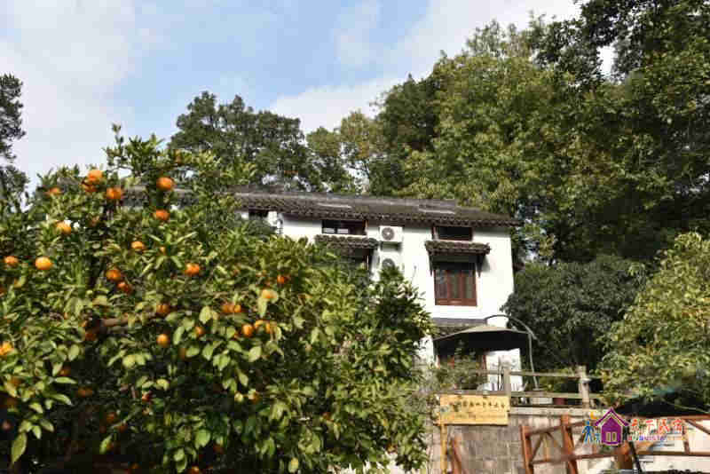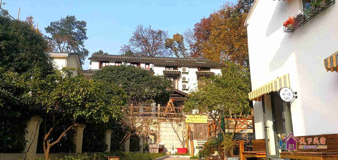 掩映在半山的青翠幽静中的旅舍是典型的江南风格的两幢小楼,承展着古典唯美的白墙黛瓦花格窗,窗外便见连绵葱翠的翁家山和龙井山,沿路则植满了令人沉醉的桂花树。旅舍有很大的院子,院子里有古朴的石板地和木平台、有一整片新种的龙井茶园、有游着锦鲤开着睡莲的池塘、有蜿蜒的山坡石路和平坦的草坪宿营区、还有很多的桂花树桔子树腊梅树和经常蹦跳着松鼠的参天毛栗大树。春秋更迭,四季分明的樱花、牡丹、桂花和腊梅让空气中都一直充满了陶醉的味道。清晨,很多鸟儿会用动听的歌声叫你起床,夜晚,阁楼的天窗则可以让你数着星星进入梦乡。