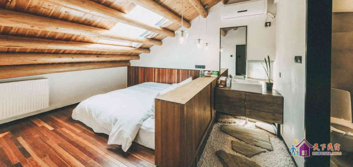 民宿采用全环保材料、全实木装修,配备地暖或暖气。设计师老板共提供7个北欧风格的个性客房,包括庭院景观房、书香榻榻米房、观星阁楼房、夕阳露台房等。