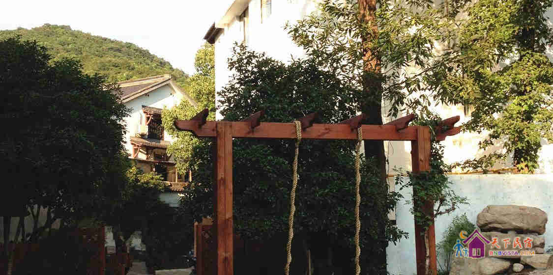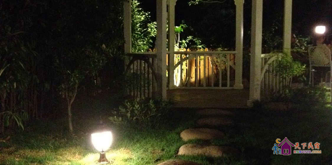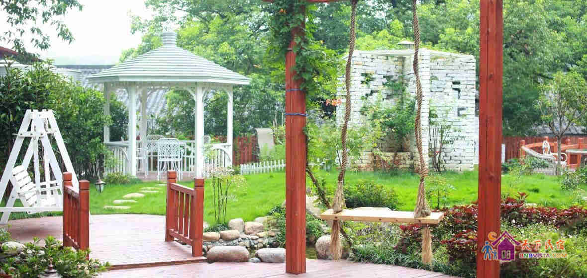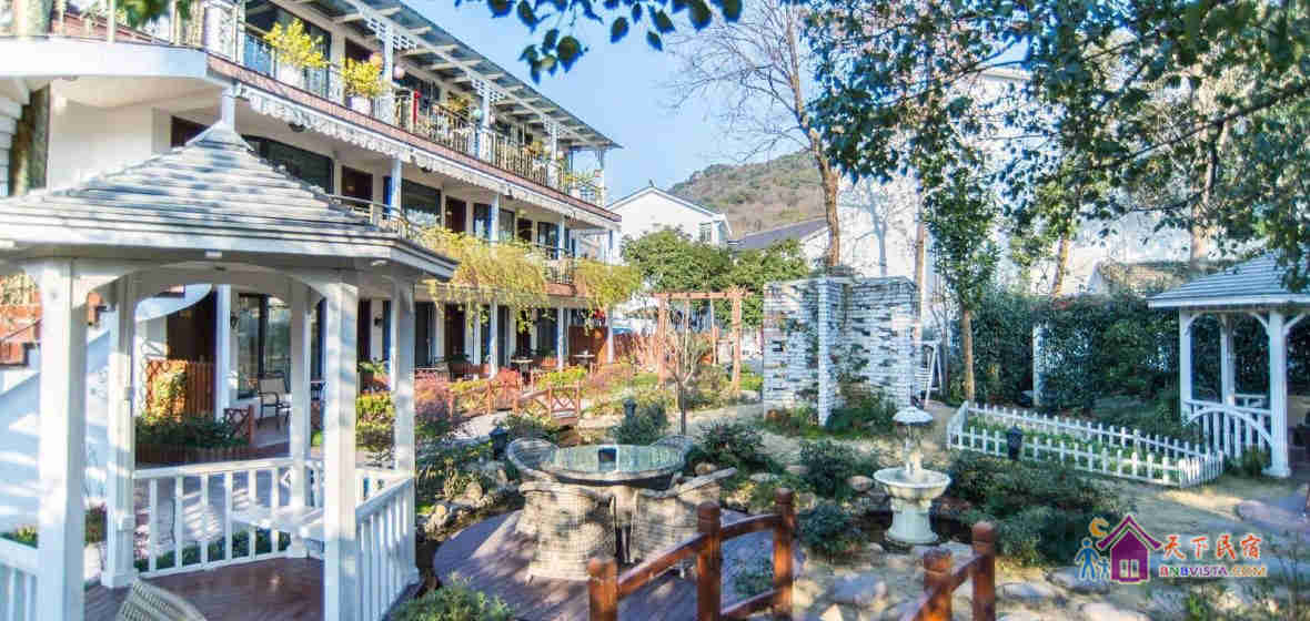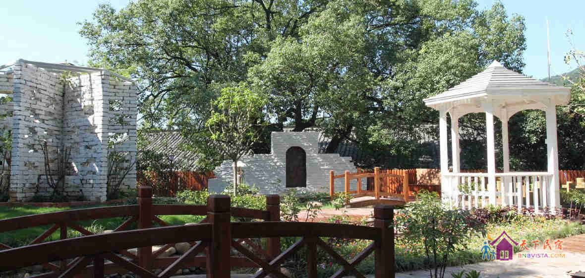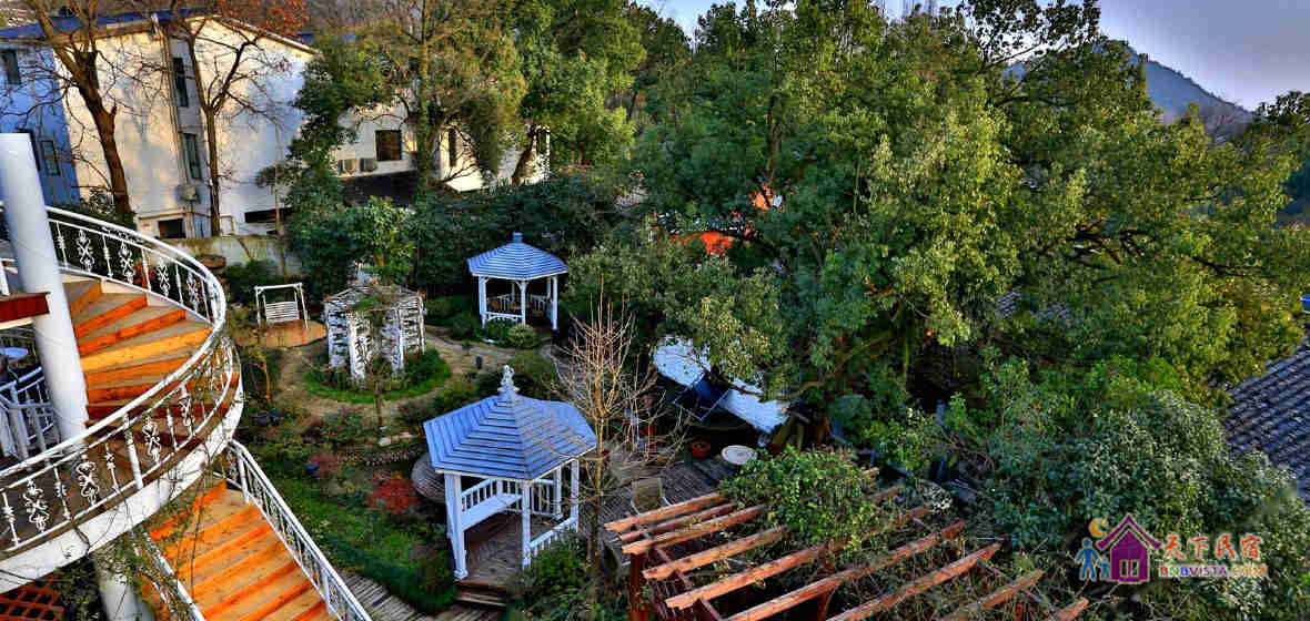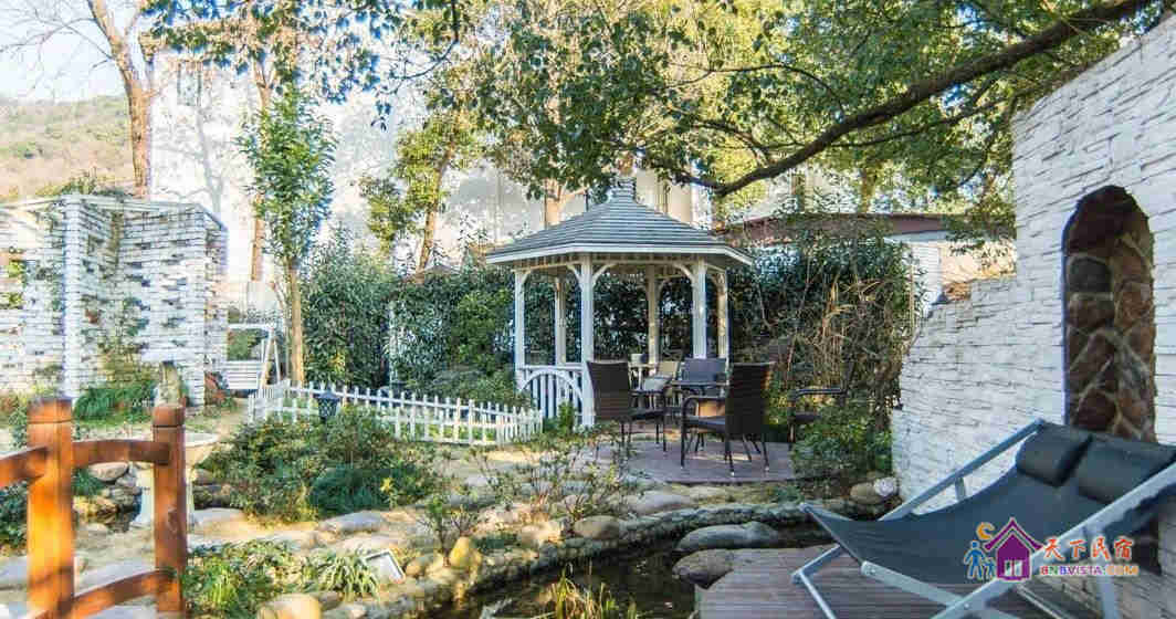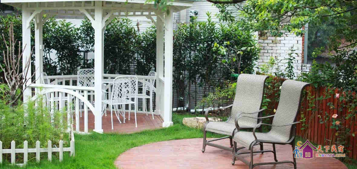 杭州珑璟心情民宿建筑外观显得比较洋气,进门是一个大约有三百多平米的大院子,有小桥、有流水,一个爬满了蔷薇和凌霄花的“花塔”,草地上摆了几张藤桌藤椅,两个白色的欧式凉亭周边绿色植物的映衬下,显得极其干净、透亮。一棵有百年树龄的大樟树下,有一个小舞台,时常可见歌手那自弹自唱,而围坐边上的人听听歌、喝喝咖啡,看游鱼小桥间穿梭,闻着芳草的气息;这一切都无处不透出主人冲哥刻意营造的舒适休闲的氛围。