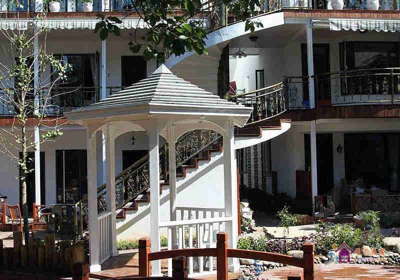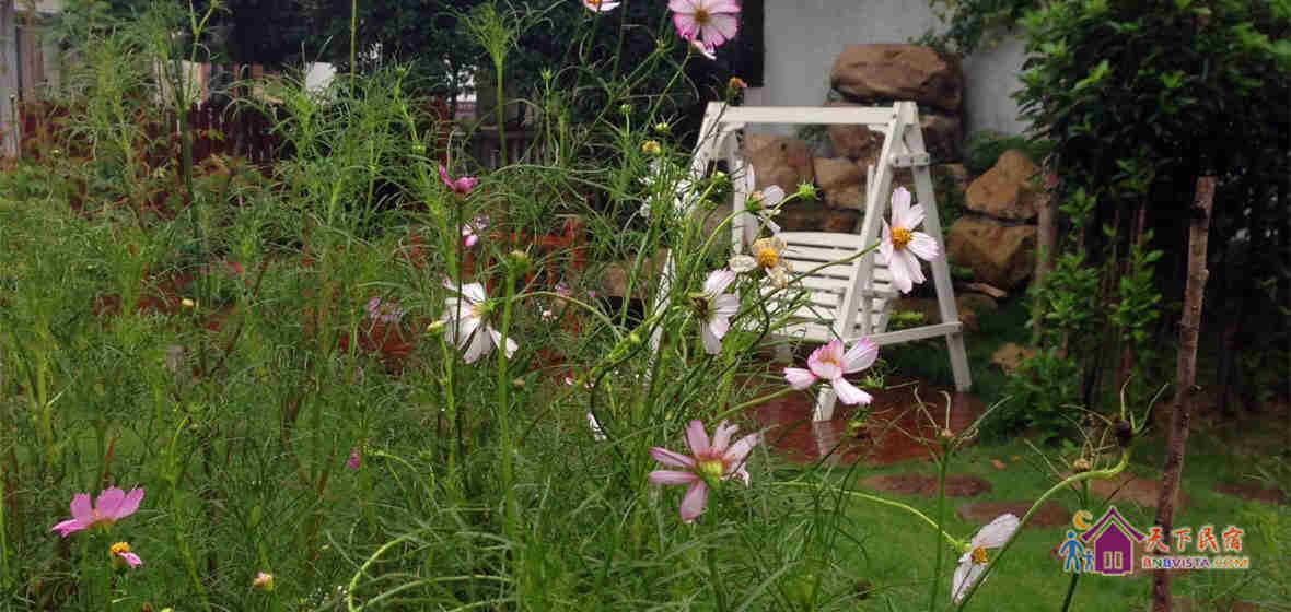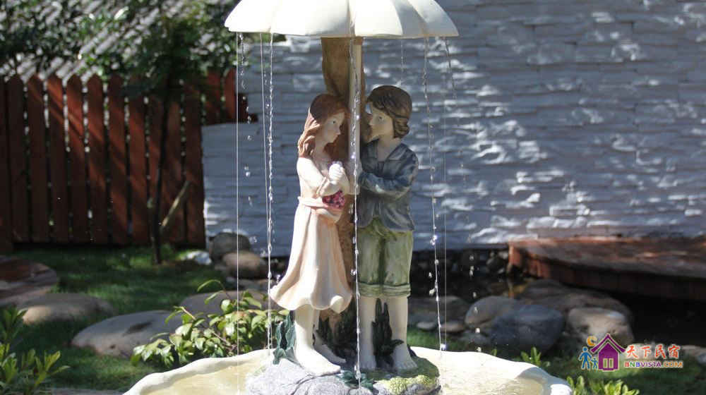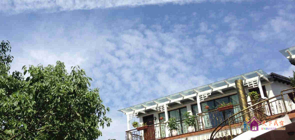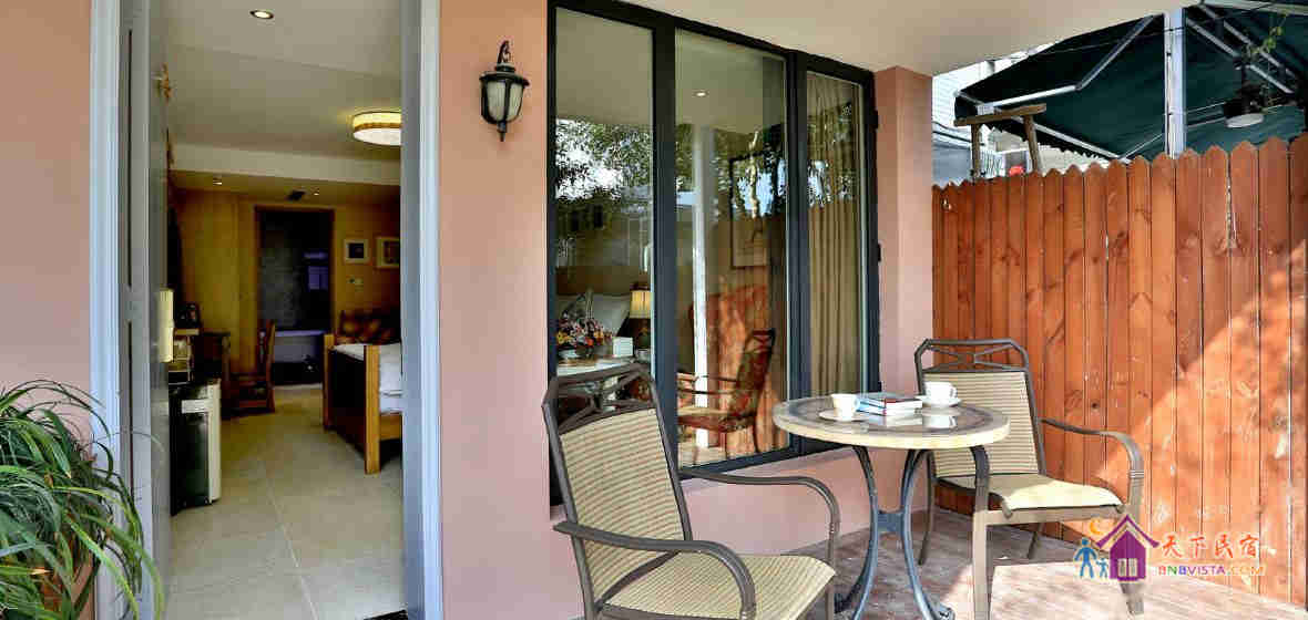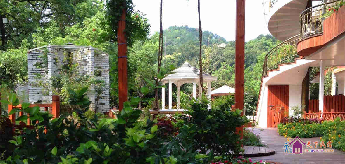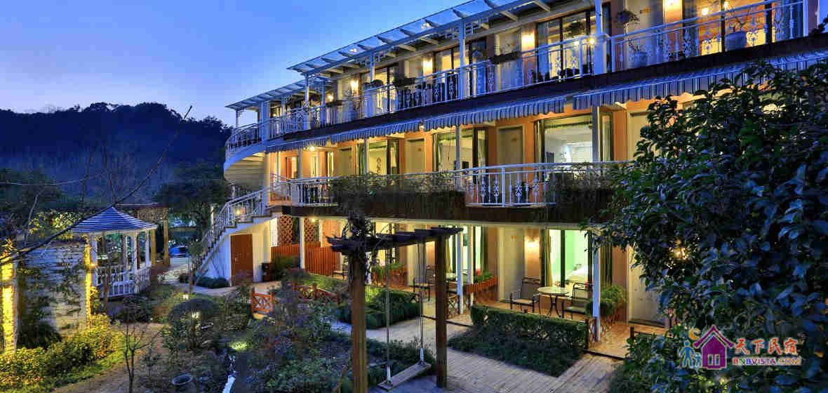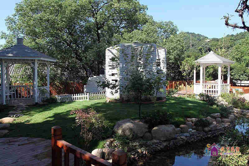杭州珑璟心情民宿建筑外观显得比较洋气,进门是一个大约有三百多平米的大院子,有小桥、有流水,一个爬满了蔷薇和凌霄花的“花塔”,草地上摆了几张藤桌藤椅,两个白色的欧式凉亭周边绿色植物的映衬下,显得极其干净、透亮。一棵有百年树龄的大樟树下,有一个小舞台,时常可见歌手那自弹自唱,而围坐边上的人听听歌、喝喝咖啡,看游鱼小桥间穿梭,闻着芳草的气息;这一切都无处不透出主人冲哥刻意营造的舒适休闲的氛围。