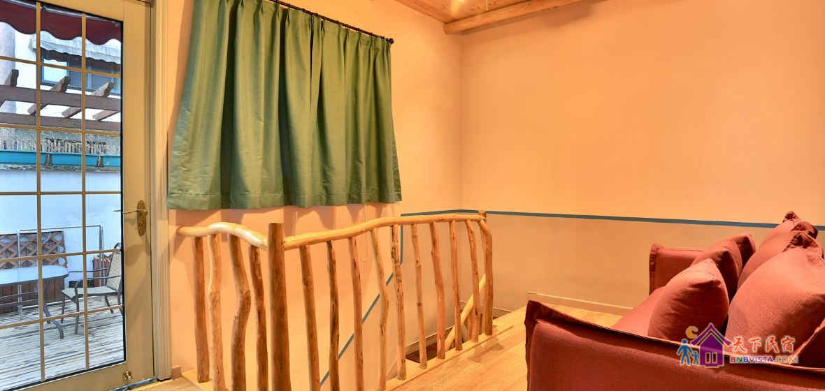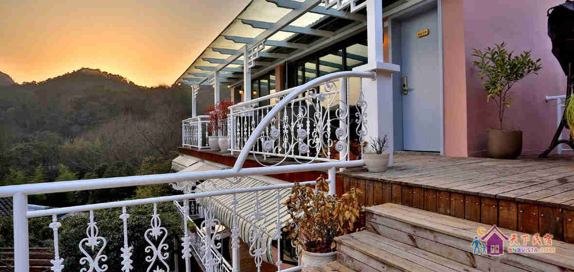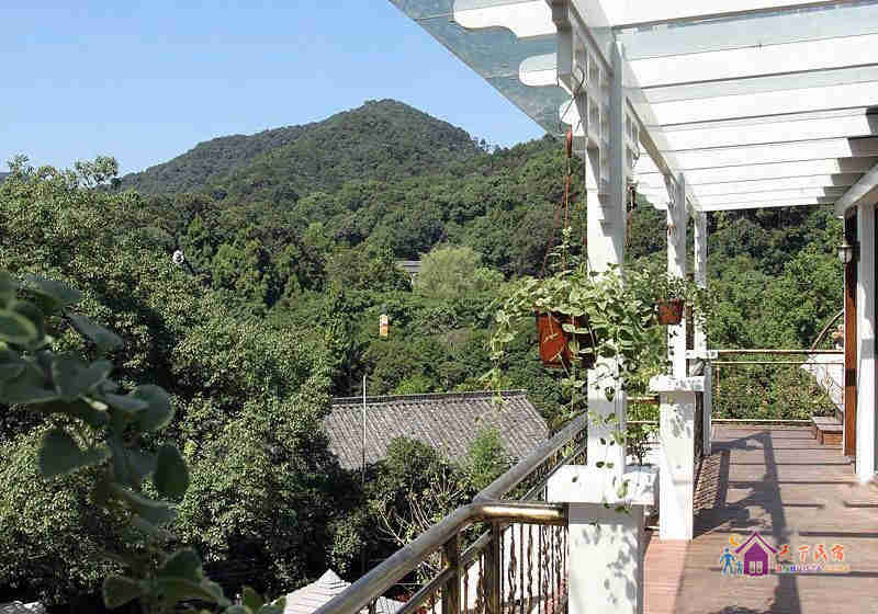 三楼的房间装饰风格独树一帜,原木的屋顶、平底落地床、壁炉、玫红沙发、还有弯弯的钓鱼灯,而最让人心动的是那一溜的落地玻璃窗,因为,从落地窗往外看,是开阔的,让人心情极其舒畅的西湖群山风景。三楼最大的二个房间一个叫“悠然南山”一个叫“宁静致远”, “宁静致远”房间里甚至还装了一个室内吊篮,斜靠吊篮里,看着窗外的无敌风景,摇啊摇,晃啊晃,此时,不管你手里拿的是一本书,还是一杯咖啡,都应该感慨一句:这才是生活啊!