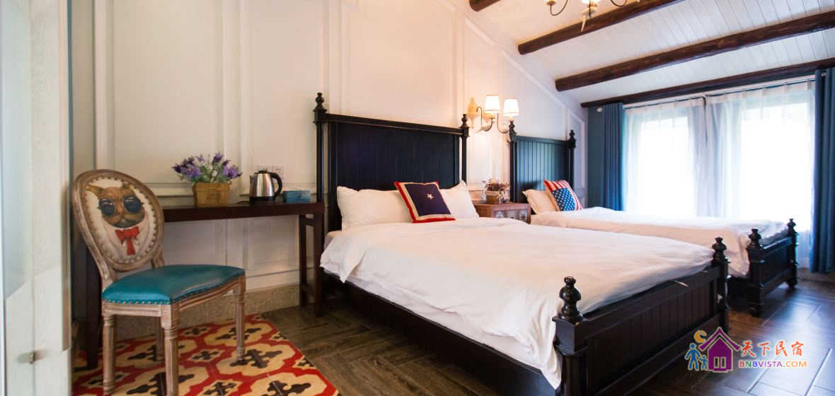 这是一家美式乡村风格民宿,隐匿于白墙黑瓦的民宅和青翠欲滴的茶园之间,恬静雅致。