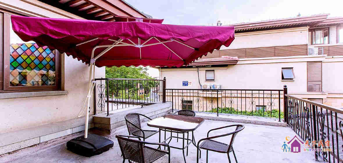 二楼超大美式复古台球室(附有棕色皮质坐感舒适的单人沙发2个,男女生同场pk的足球机1台);棋牌室,榻榻米(各种桌游应有尽有,跟小伙伴们斗智斗勇吧~到了晚上铺上榻榻米就是舒适的床啦~可容纳10人安心睡觉哦~) 还有2个房间:一个温暖粉色公主主题客房(智能机顶盒+32寸平板电视),一个管家房;一个地中海风格浴室;朝南270°可视观景露台。