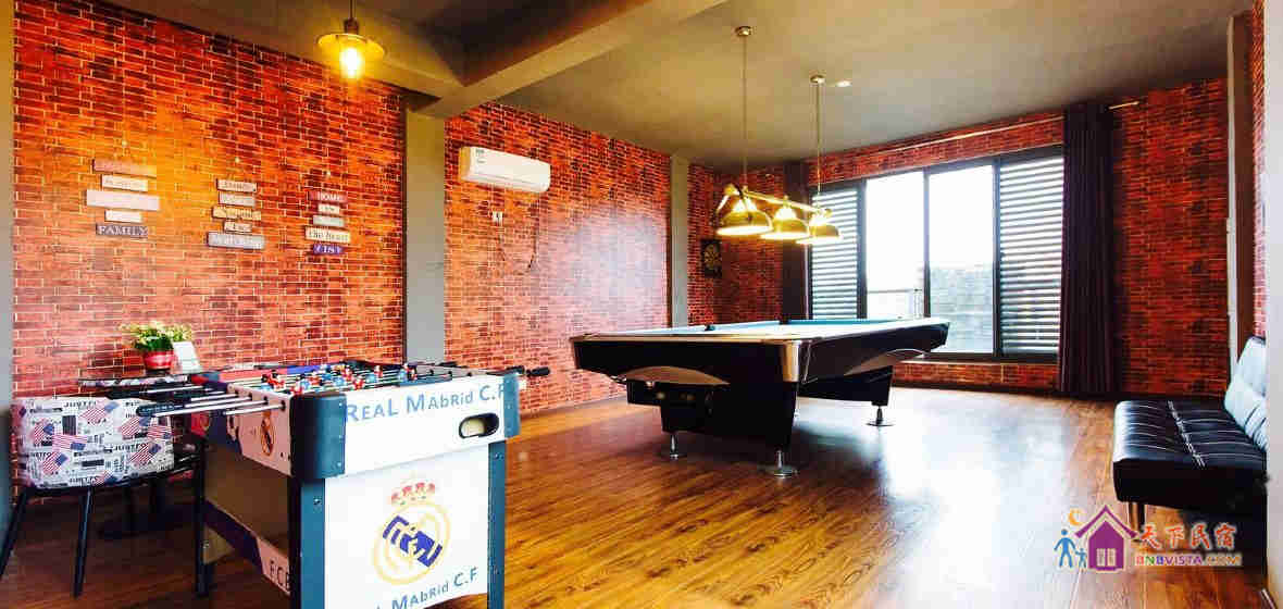 二楼超大美式复古台球室(附有棕色皮质坐感舒适的单人沙发2个,男女生同场pk的足球机1台);棋牌室,榻榻米(各种桌游应有尽有,跟小伙伴们斗智斗勇吧~到了晚上铺上榻榻米就是舒适的床啦~可容纳10人安心睡觉哦~) 还有2个房间:一个温暖粉色公主主题客房(智能机顶盒+32寸平板电视),一个管家房;一个地中海风格浴室;朝南270°可视观景露台。