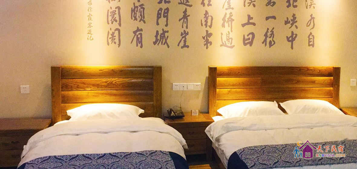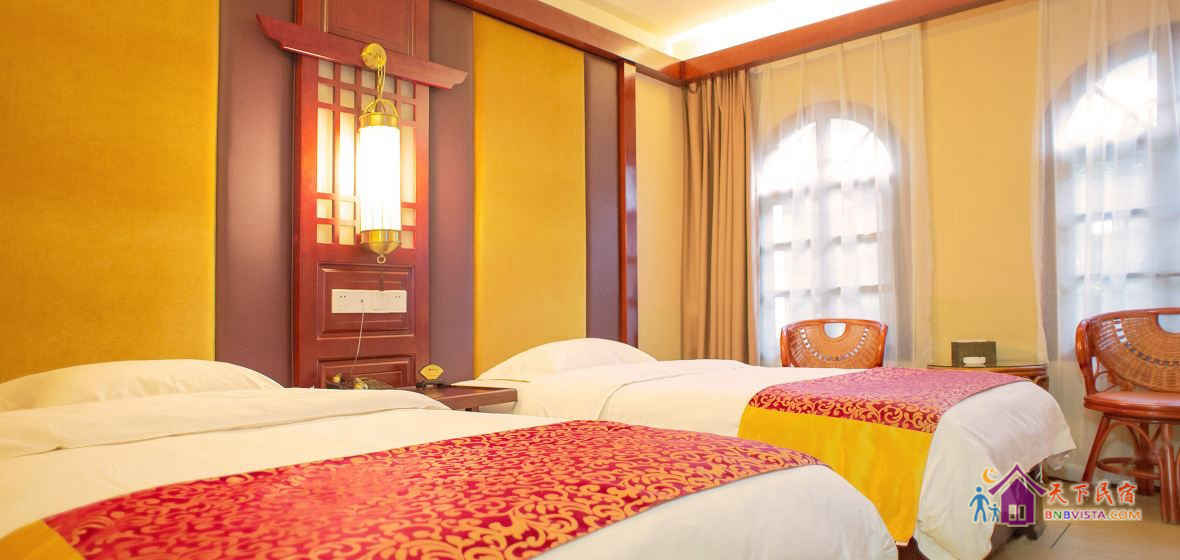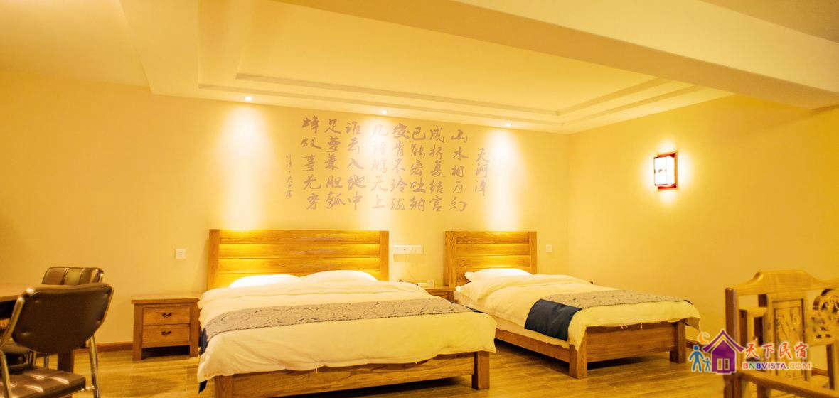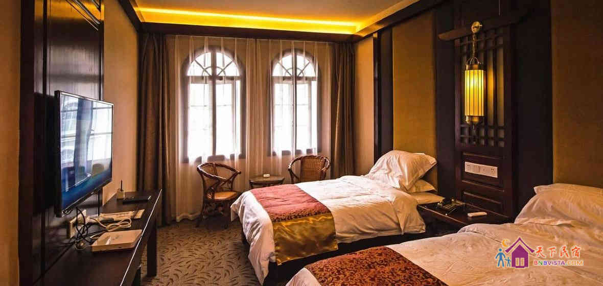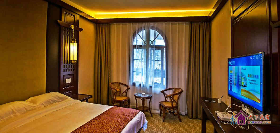 客房采用现代中式风格装修,按国家高星级酒店标准配备,营造了环境优雅、风格独特、安逸静谧的休息环境。客栈建筑面积660平方米,共有各类房型客房二十余间,投资近600万元。