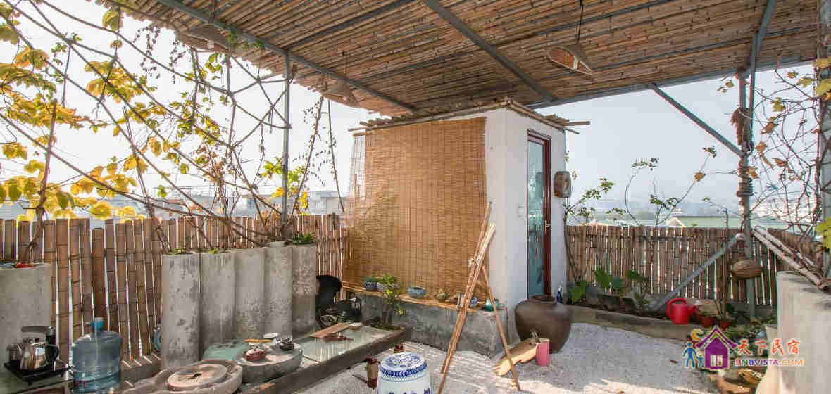 室外茶室虽然只是方寸之间,但这里的花草和物件都是创始人精心挑选。连看似不起眼的苔鲜,从几百里外的幽静山谷中挖回。夜晚,约一两知已闲坐此地,往解放桥方向看去,不仅可以近在眼前的都市繁华,更可以看到创始人首度撰文呼吁重建的“逍遥楼”的华丽夜景。