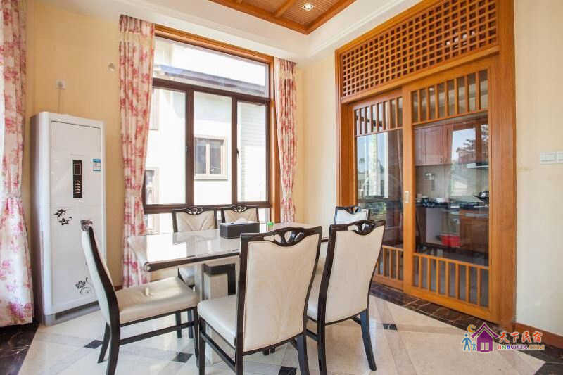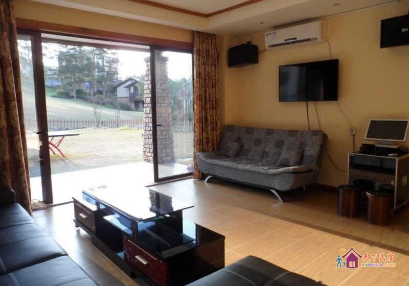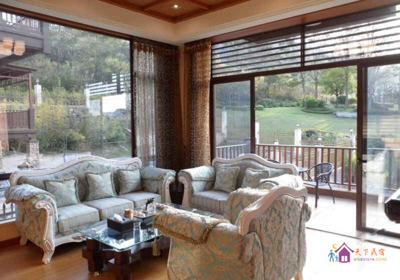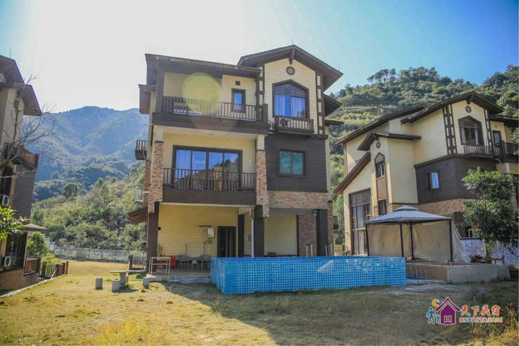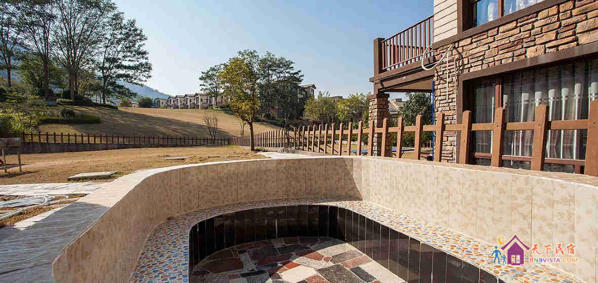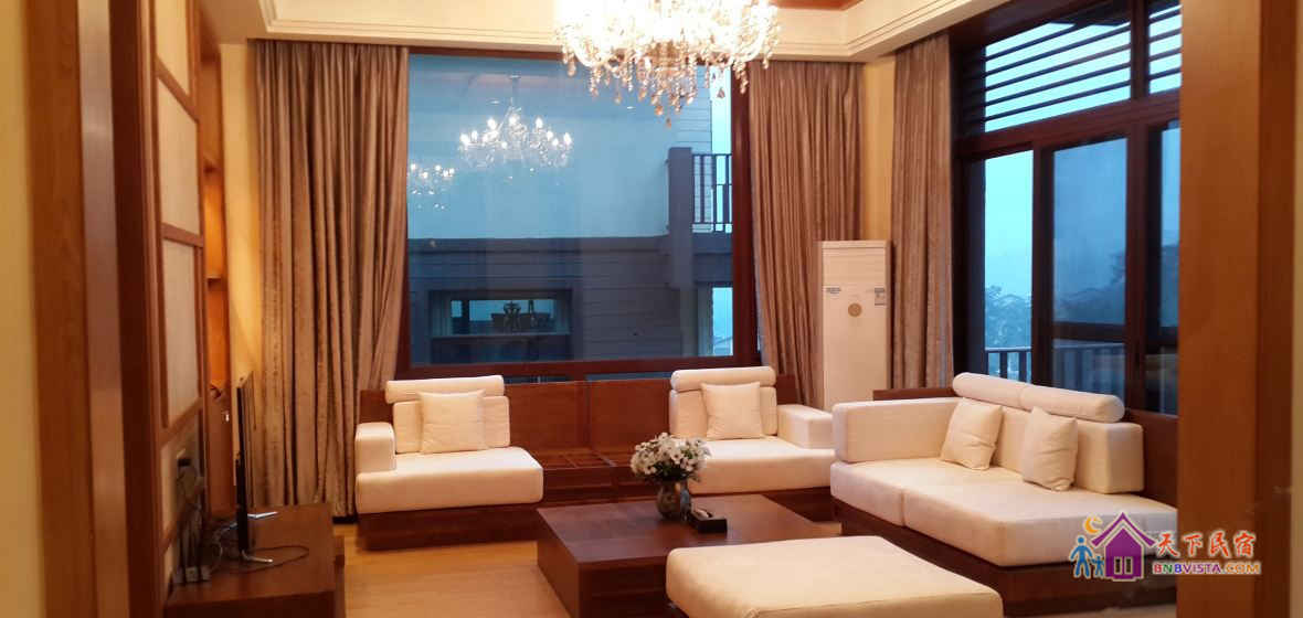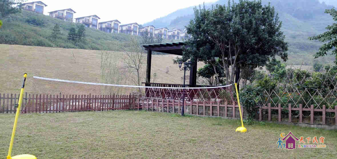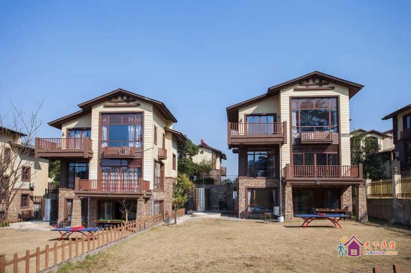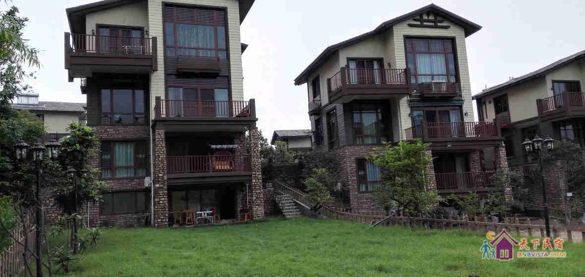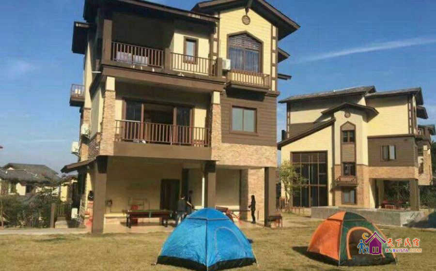 别墅后花园设有免费的草坪羽毛球场、乒乓球台、烧烤炉,厨房免费使用(电饭煲、电磁炉、微波炉、不粘炒锅、冰箱、消毒柜等设备齐全)。别墅类型为独栋别墅,视野开阔(客厅与其他别墅相距约100米远),四层建筑面积300平米,花园面积近500平米,别墅四周群山环抱、潺潺溪水环绕、景色优美。