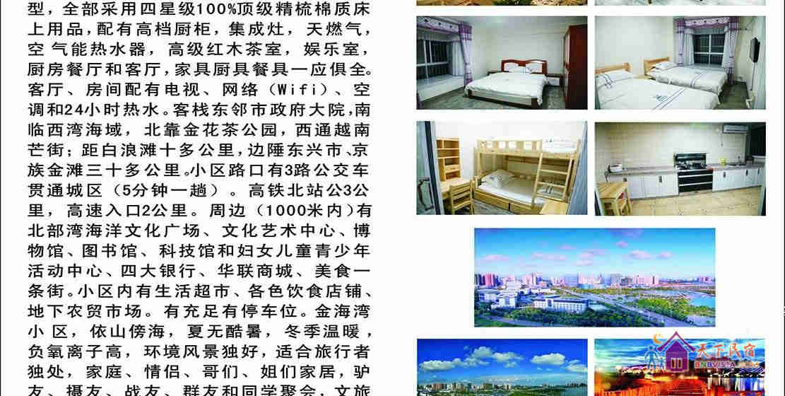 防城港西海湾客栈为楼中楼设计,全海景豪华装修,客栈设有豪华情侣套间、标准双人间、标准单人间和儿童房四种房型,配有高档厨柜、集成灶、天燃气,空气能热水器,高级红木茶室,娱乐室,厨房餐厅和客厅,家具厨具餐具一应俱全。客厅、房间配有电视、网络(Wifi)、空调和24小时热水。