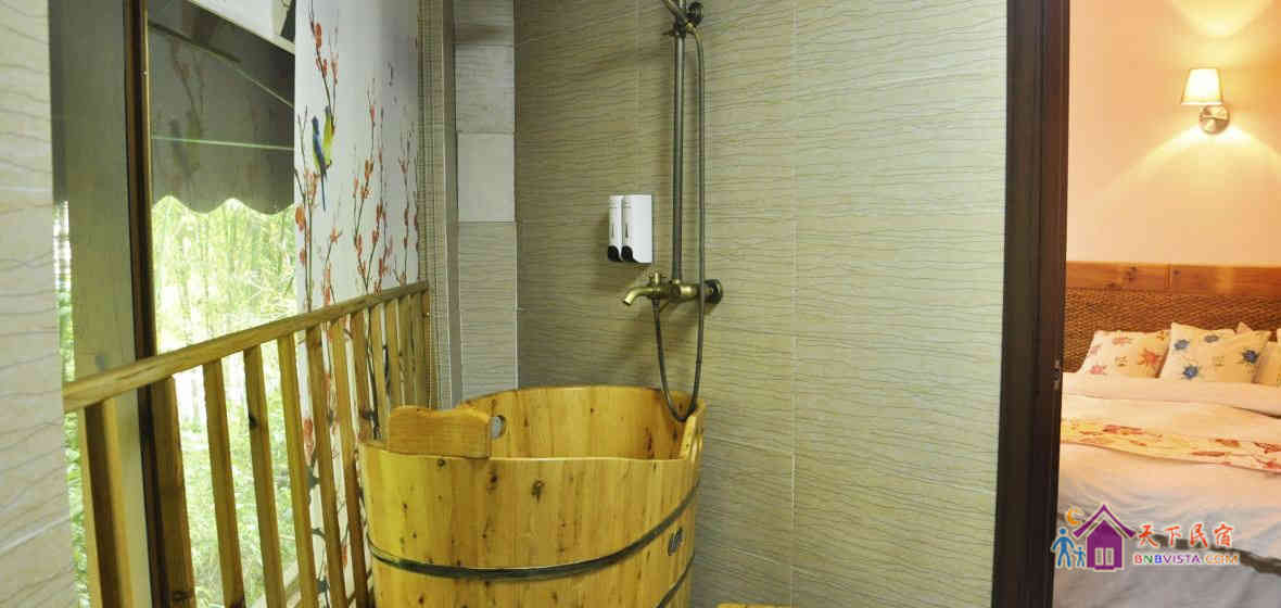 天然木质结构的设计勾起了每个人心中的木屋情怀,恍如是陶渊明笔下的世外桃源,可谓是独具匠心,浑然天成。客房内有柔软的大床,充满田园风情的抱枕、摆设,还有大大的木桶,大人、小孩都能在里面泡澡放松。