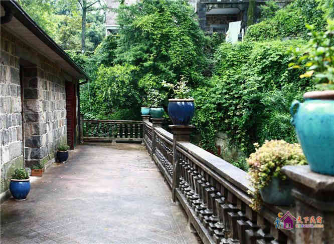 161号别墅进门便是一个大大的庭院,一栋用褐色花岗岩筑成的二层楼房,阳台也是大大的。它的大门口沿阶而下,左边是杉树,右边是石墙,前边有一个石门洞,门洞上刻着"怡柯小筑"四个字,那也许是工匠们擅自刻上去的。走进石门洞,沿着数十级台阶而上,又是一番景色。