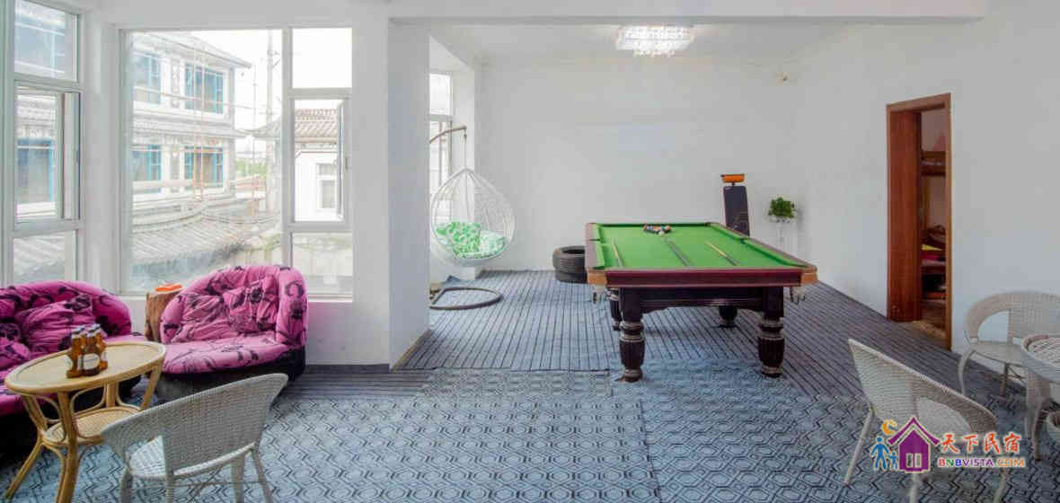 客栈环境优美,院内有众多大理特色花木,小池内观赏类锦鲤、乌龟悠然自在,同时设置了清吧区、娱乐区、阅读区、独立厨房及电影大厅等多类公共场所,在客栈4楼的观景台,约上三五好友,白天可看苍山云卷云舒,晚上可观繁星点点,赏古城静谧。