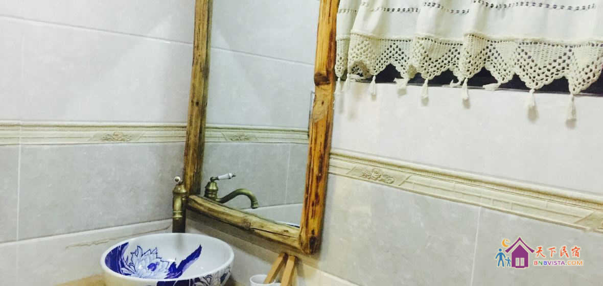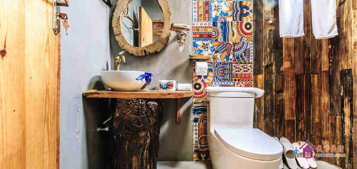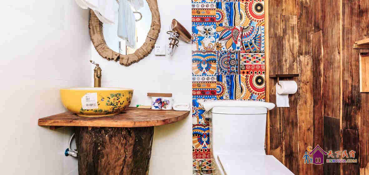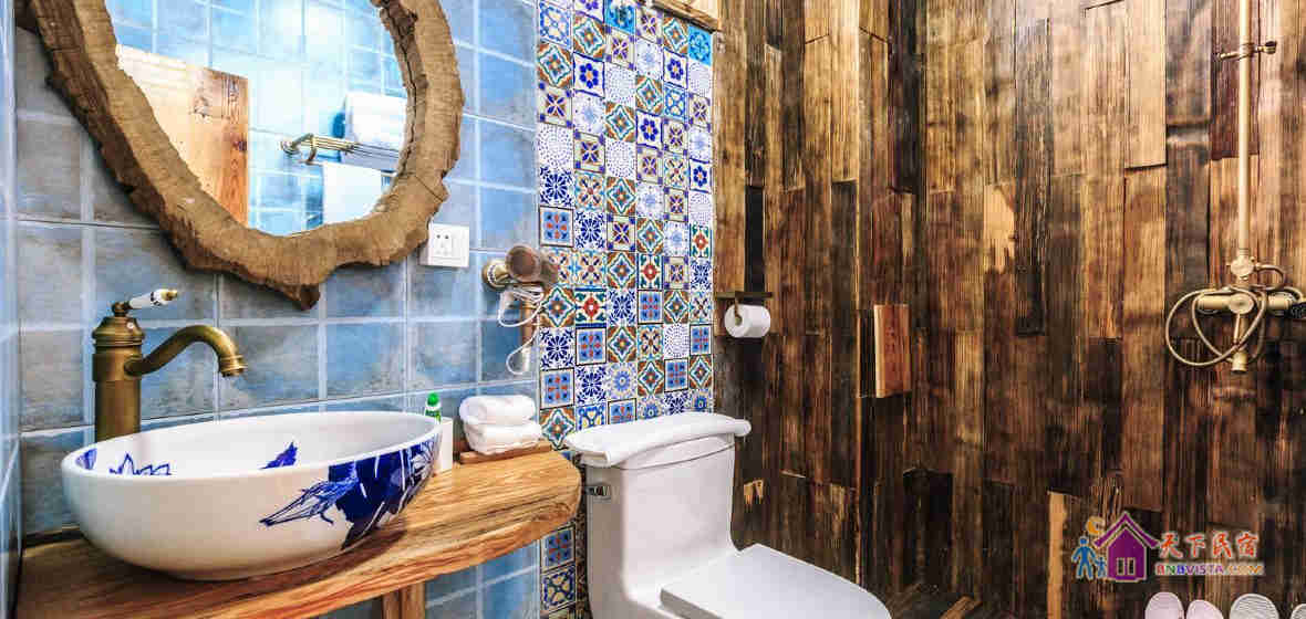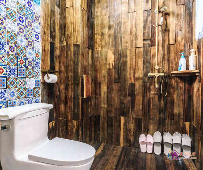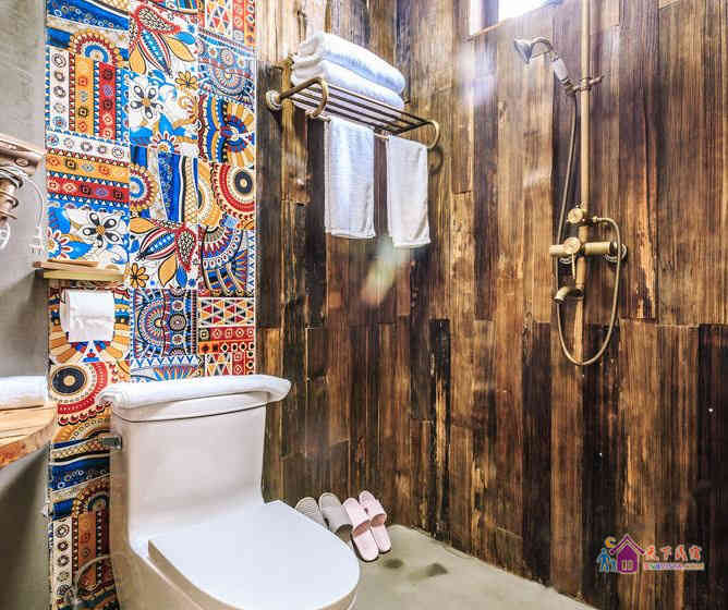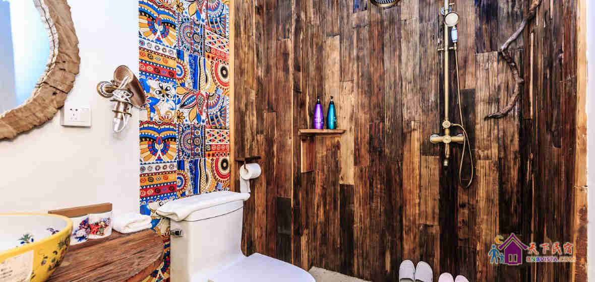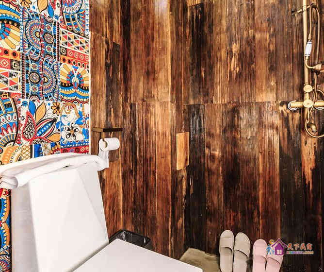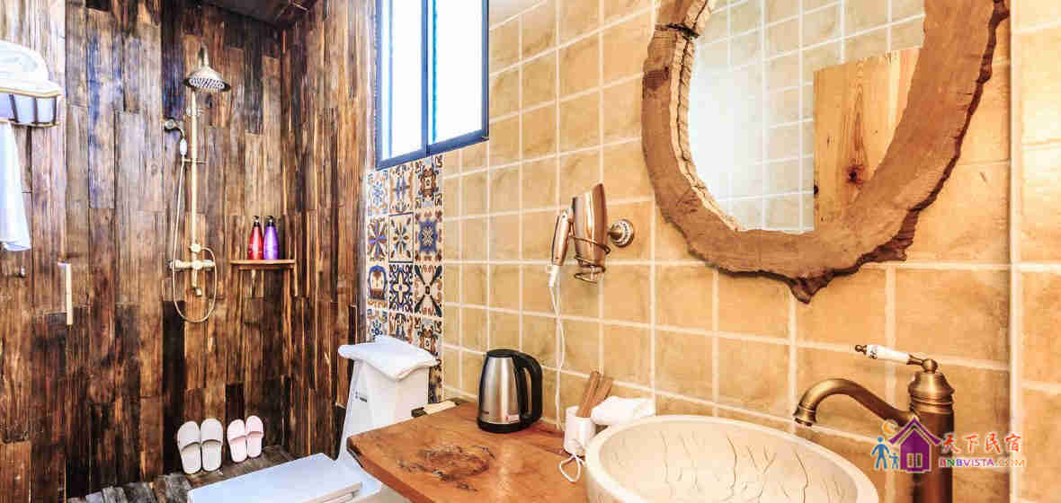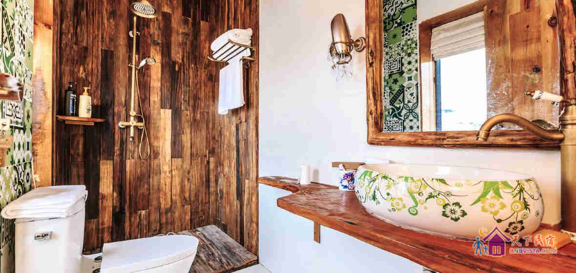 极具个性化的设计风格,洗手间里的装饰材料来自大理剑川山区海拔4000米的彝族山寨里的木屋顶上的木瓦板,经过几十年的风吹日晒,充满了沧桑感,新新在去山寨里支助特困生家庭时无意中发现了这么好的材料,于是提出帮寨子里换新瓦顶,于是把老木瓦板拉回了大理,用于洗手间的装饰。