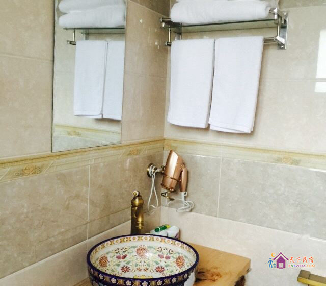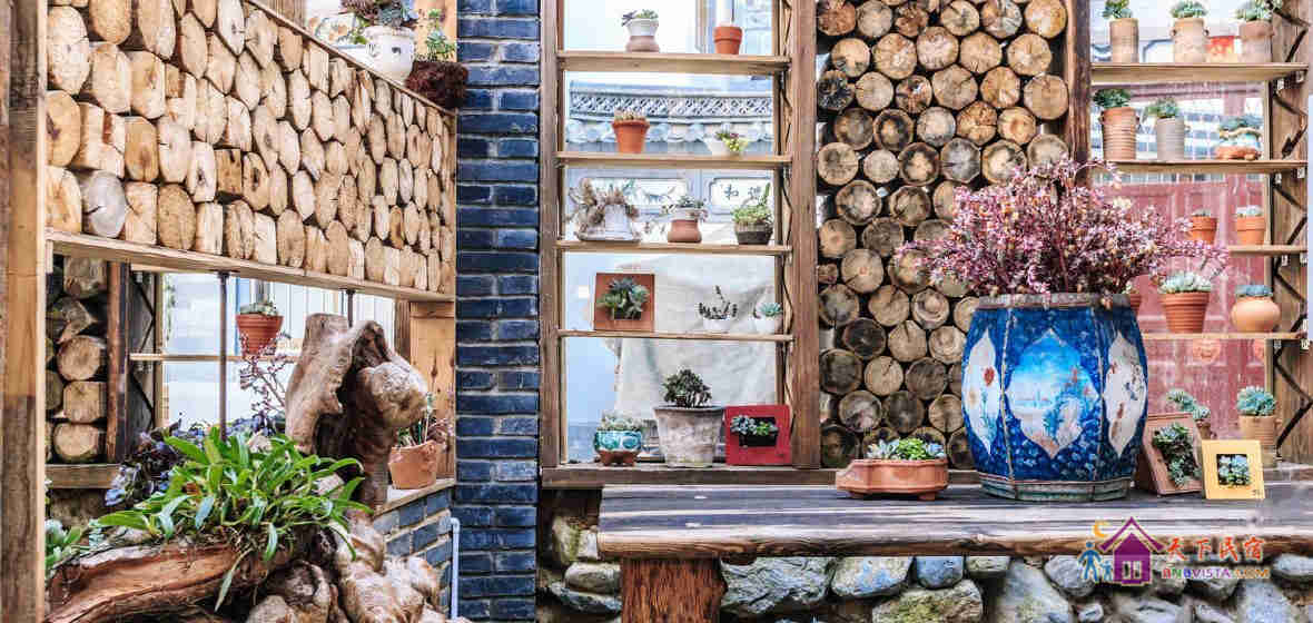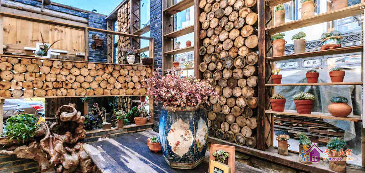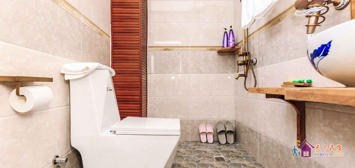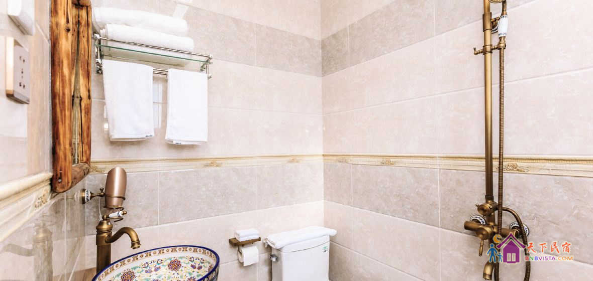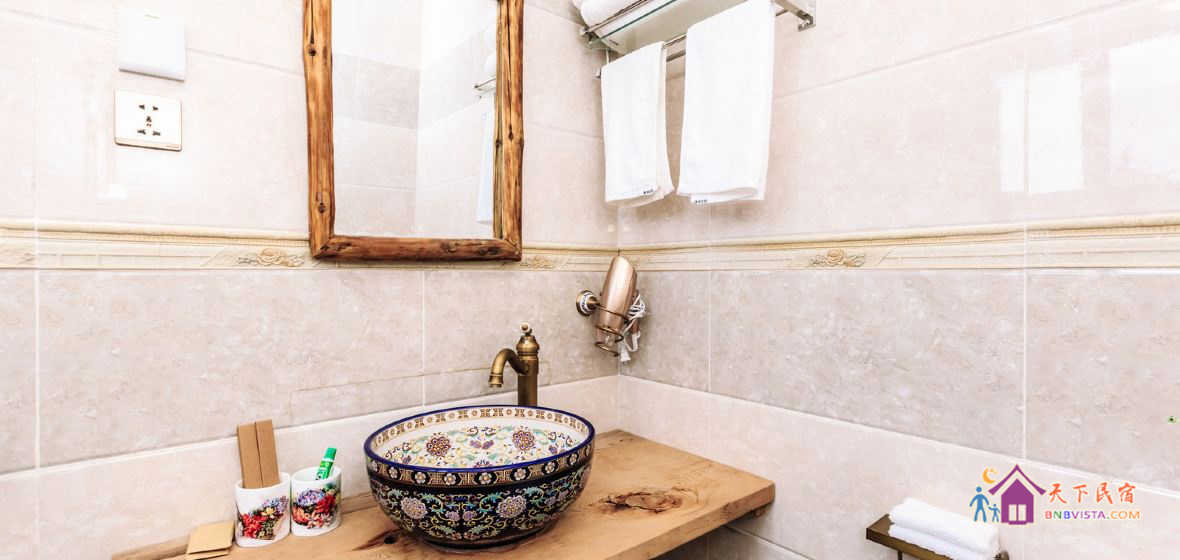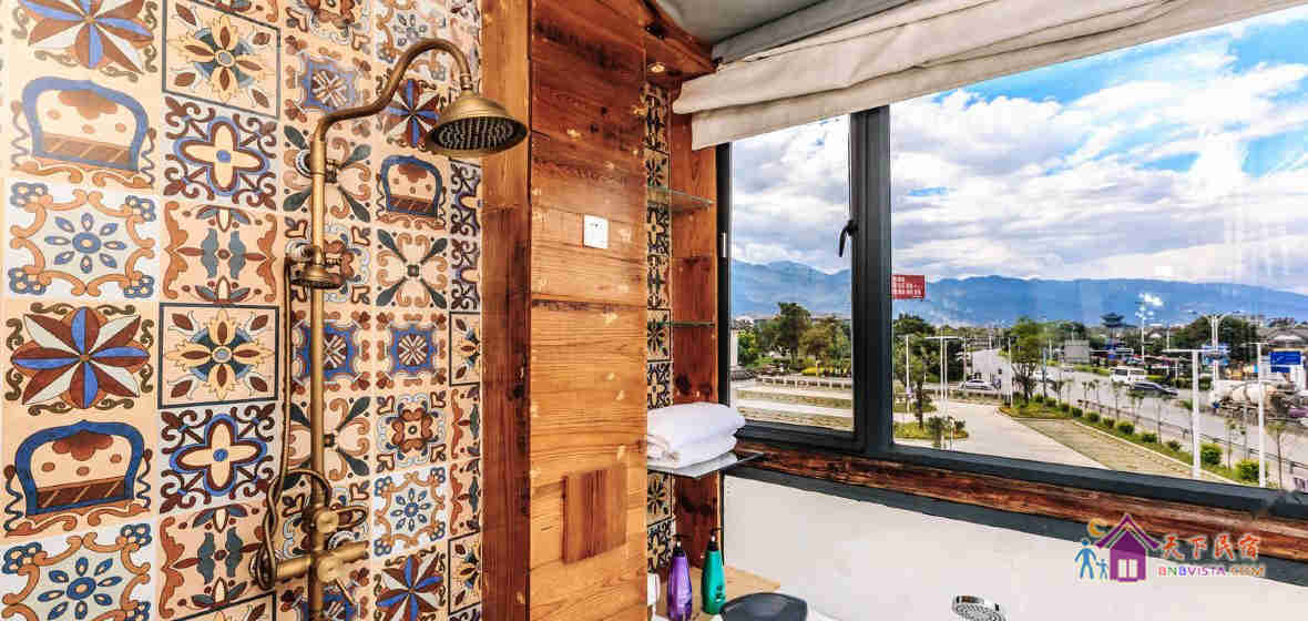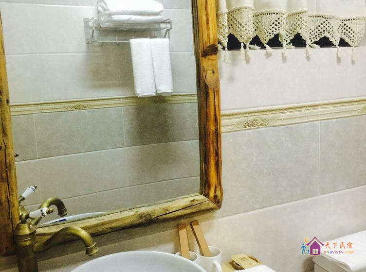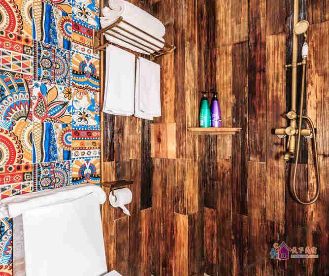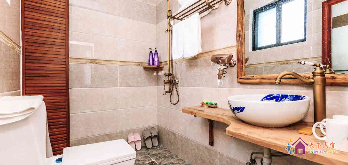 极具个性化的设计风格,洗手间里的装饰材料来自大理剑川山区海拔4000米的彝族山寨里的木屋顶上的木瓦板,经过几十年的风吹日晒,充满了沧桑感,新新在去山寨里支助特困生家庭时无意中发现了这么好的材料,于是提出帮寨子里换新瓦顶,于是把老木瓦板拉回了大理,用于洗手间的装饰。