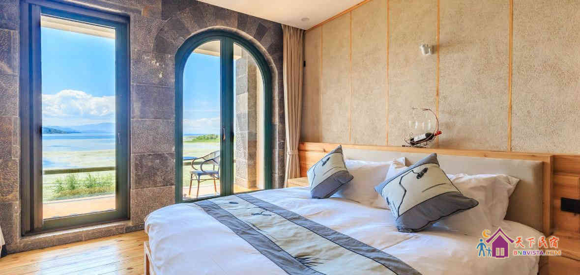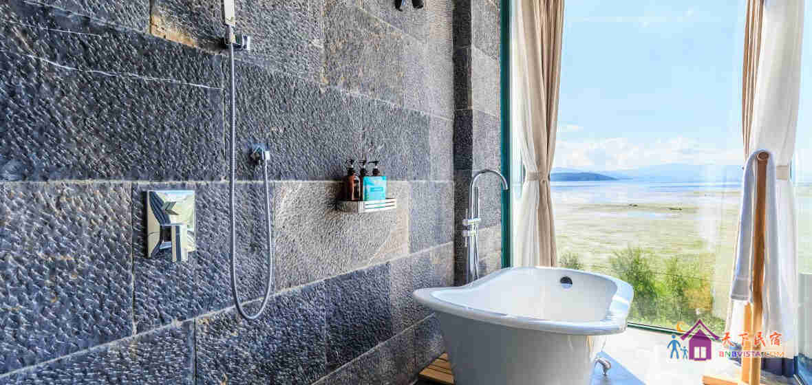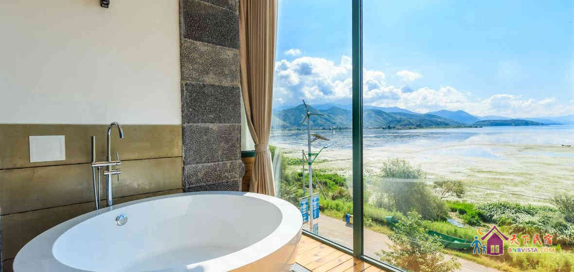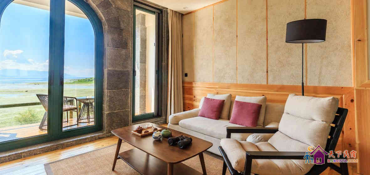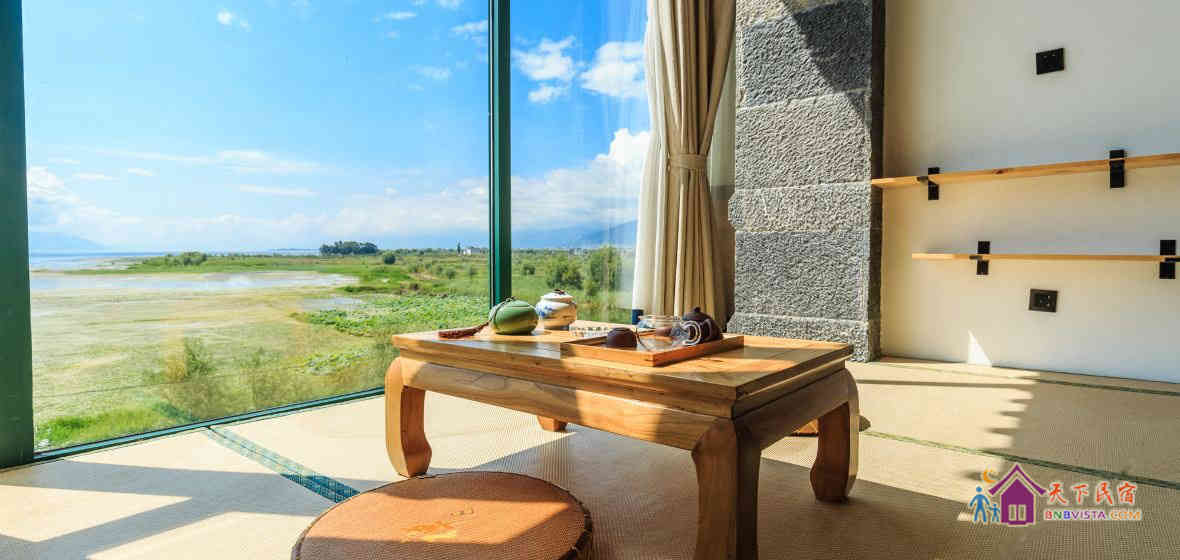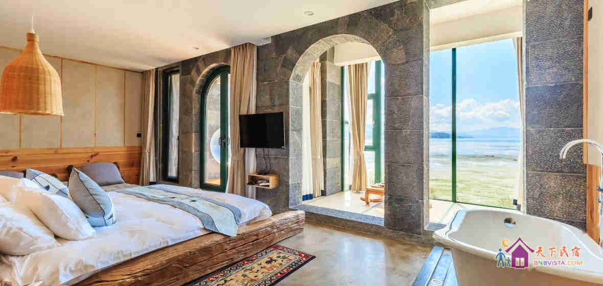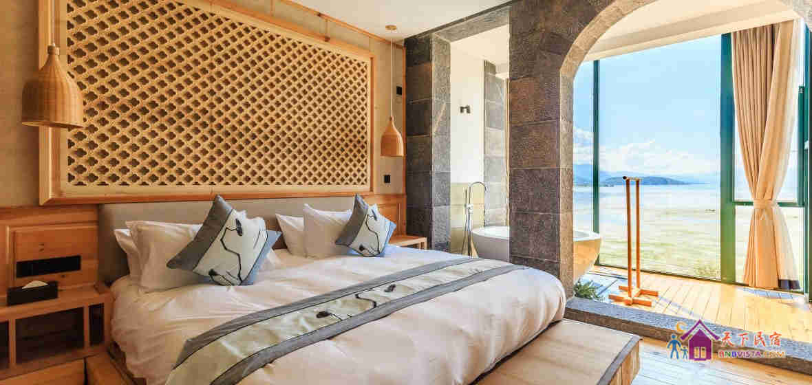 从大厅到房间内部,每一个角落都是静谧的禅意空间,每处都是自然与匠心、古朴与现代的完美融合。每一间房都拥有广阔的观景视角,每一间房都能看到波光粼粼的洱海和苍山流转的行云,躺在床上或者露天浴缸就能感受来自海面的清风,足不出户就能与对面东湖湿地公园的候鸟亲密接触。