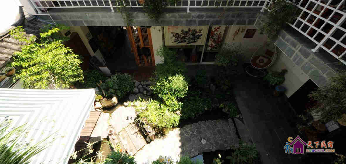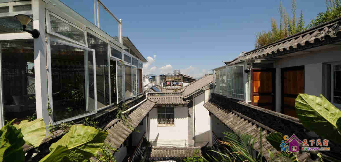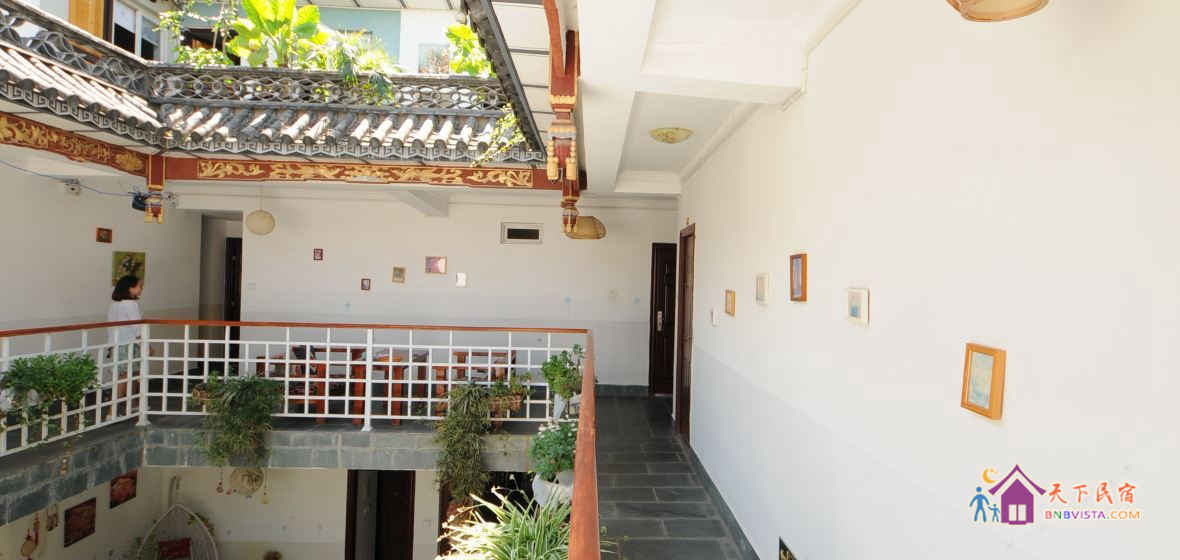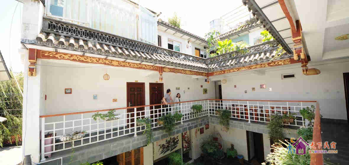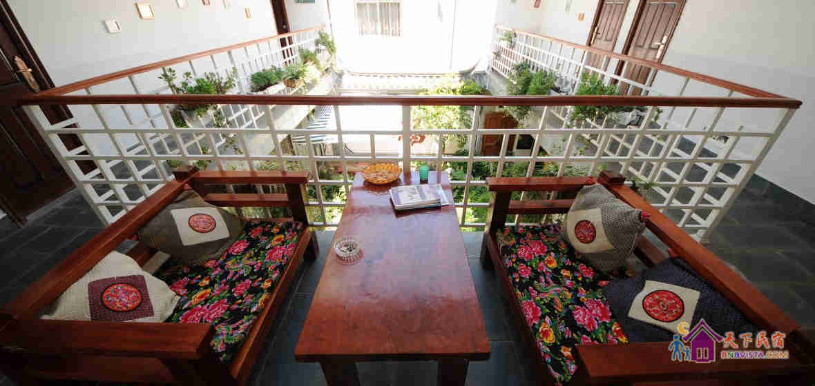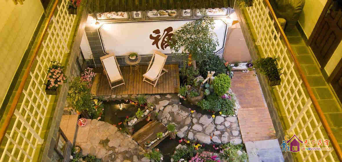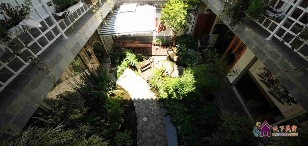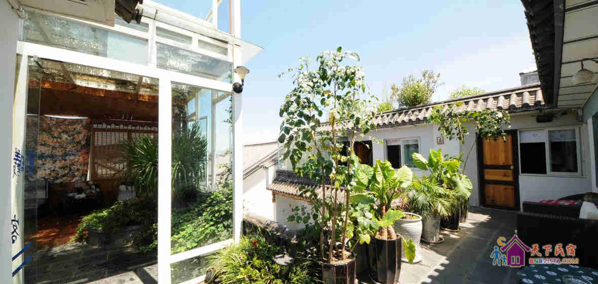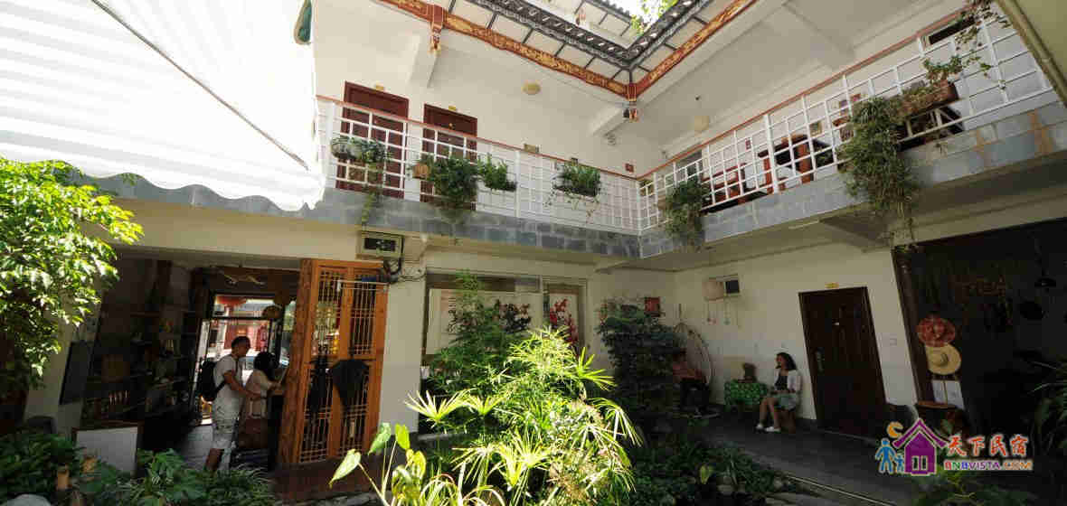 客栈是传统的白族民居四合院布局,院子里小桥流水,郁郁葱葱。一楼客厅可以泡茶聊天,三楼阳光房休闲读书、沐浴大理的风花雪月,楼顶观景台,可看全景苍山,揽月摘星。