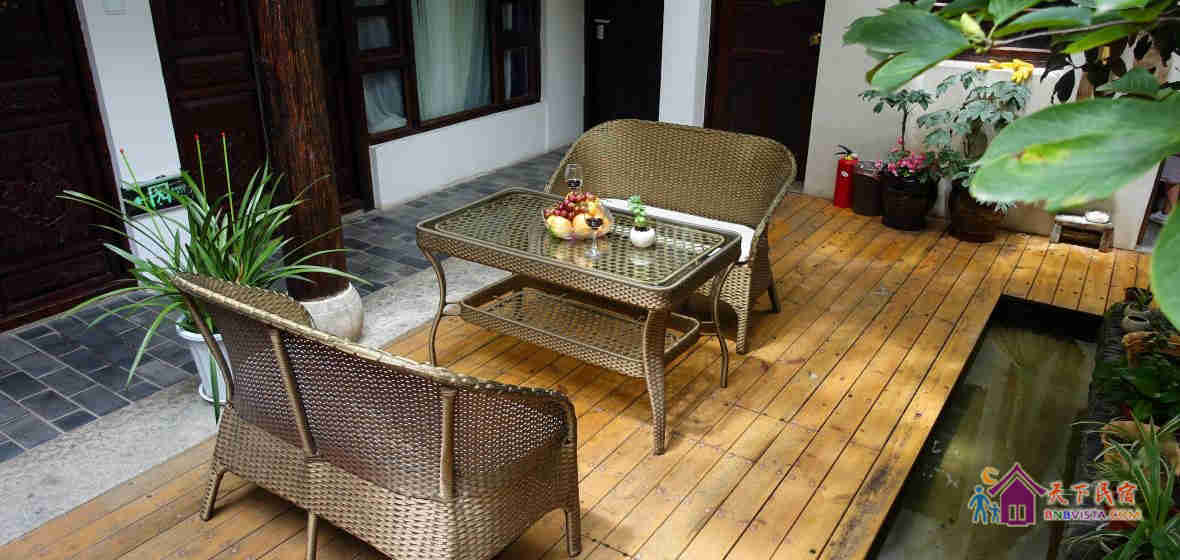 客栈装修:别院内房间不多,每间各有特色,精致而不失古色古香的装修风格,床品、洗漱用品等配套设施都是按照星际酒店的配置。公共区域建有凉亭,可饮茶聊天。院子小溪流水,鱼儿撒欢。