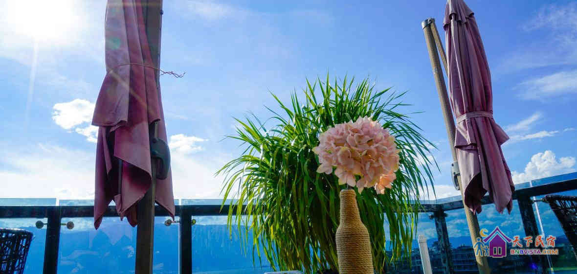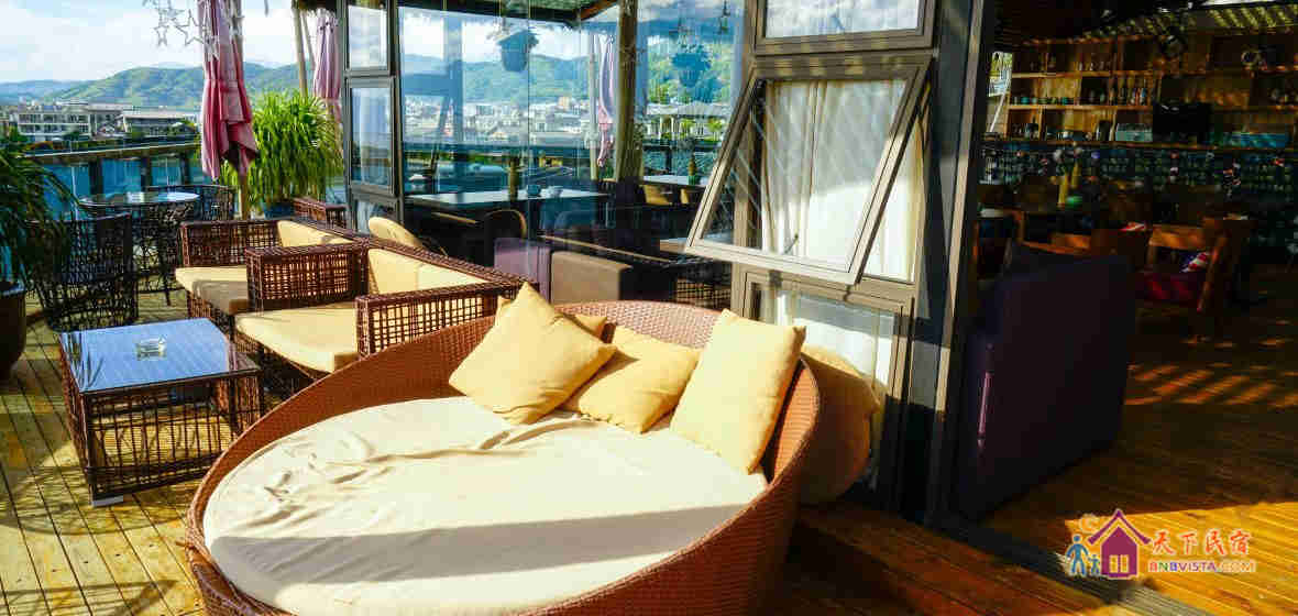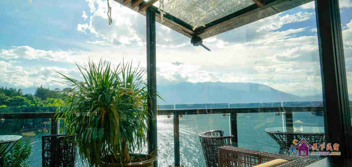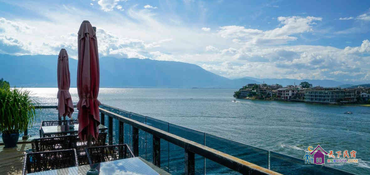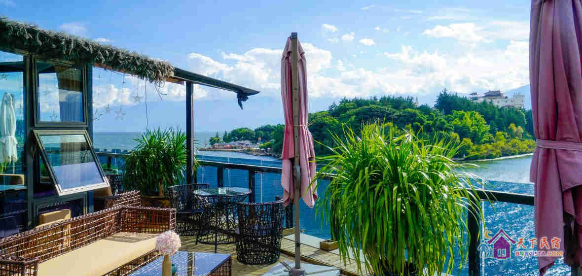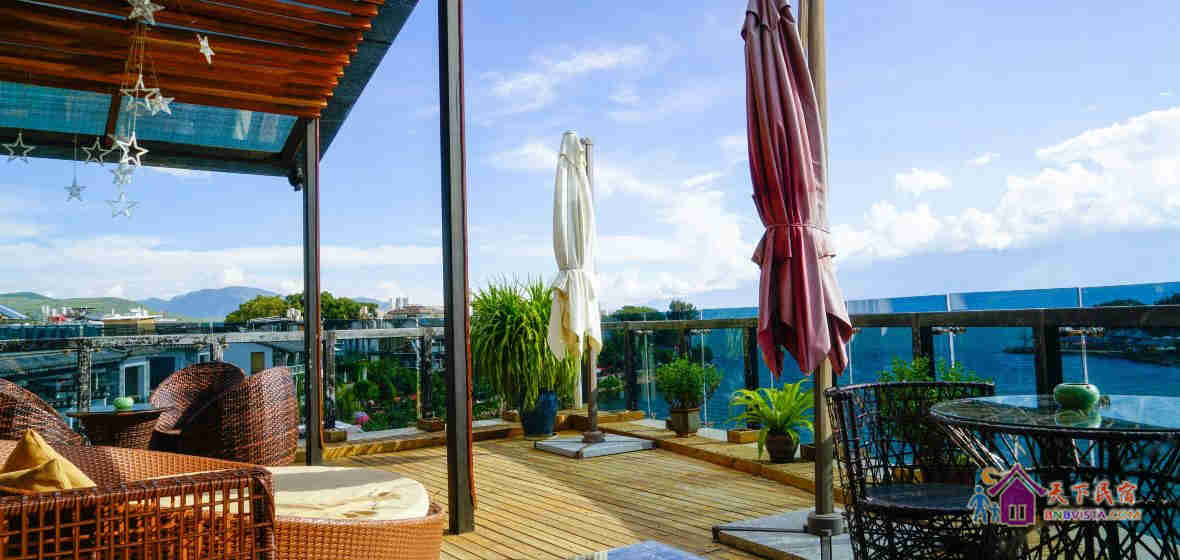 屋顶360度观海露台,不仅给普通旅客提供理想的视野,更是摄影者的天堂。夕阳西下,远处的火烧云挂在苍山顶,南诏风情岛在夕阳的映射下熠熠生辉,打渔的小船漂浮在海面上,点点白帆。