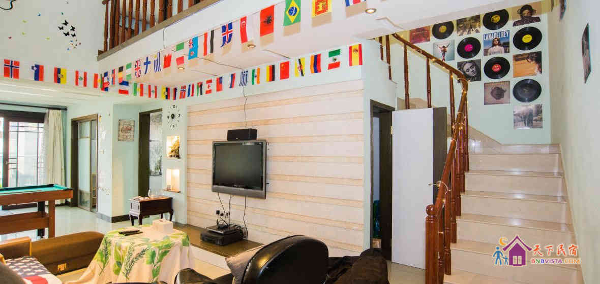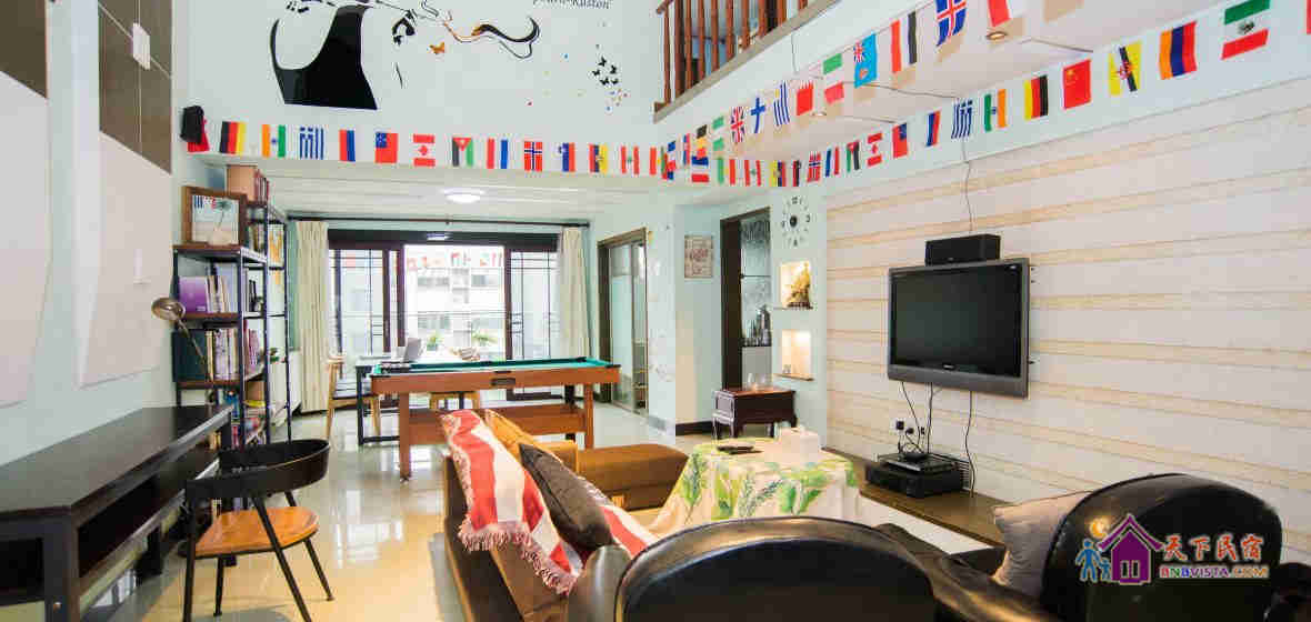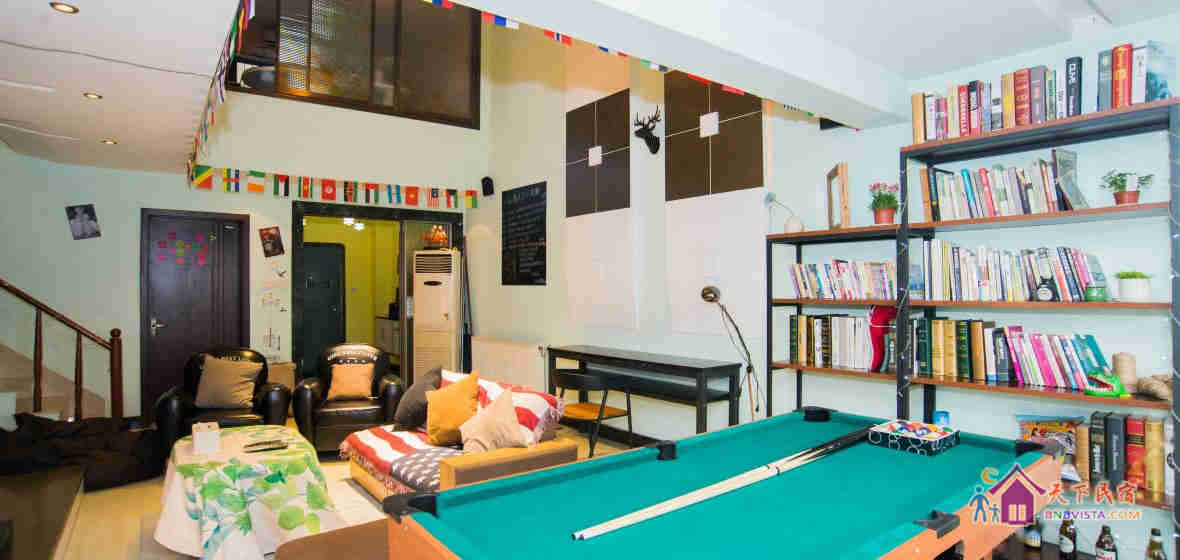 这是一套青旅风格的中空复式楼,面积约270多平米,客房空间宽敞,房内采用品牌纯棉床上用品、记忆棉床垫和按摩枕头。这里还设有阅读区、餐厅、娱乐设施一应俱全。